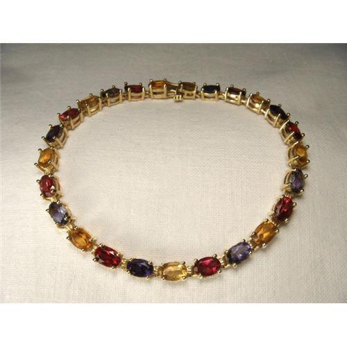You are looking at an estate 14K yellow gold tennis bracelet with gemstones. This lovely piece features 9 citrines, 4 garnets, 4 pink tourmalines and 8 tanzanites, each measuring 6 mm long by 4 mm wide. All gemstones are natural. The bracelet measures 7 and 1/2 inches long by 3/16 of an inch at its widest point. The piece weighs 10.4 grams. It is in mint condition.