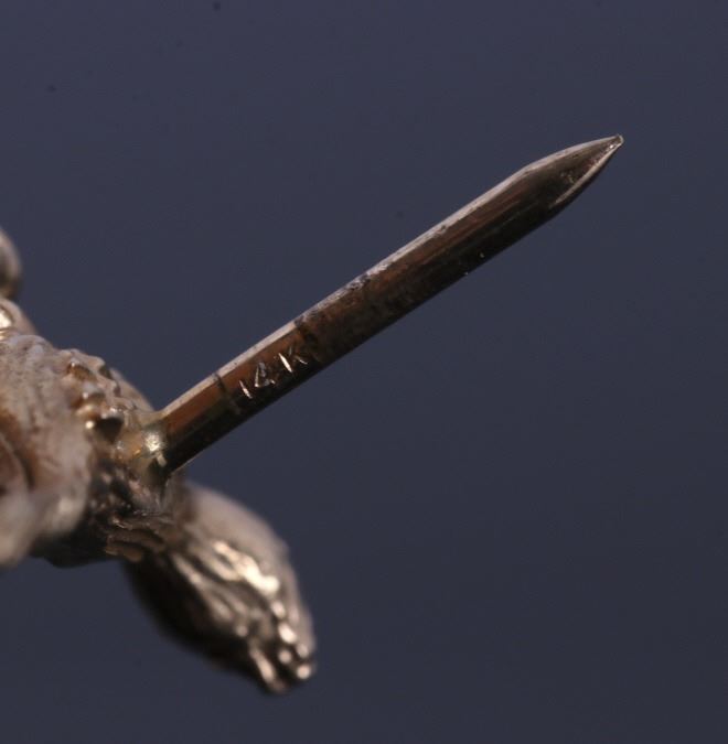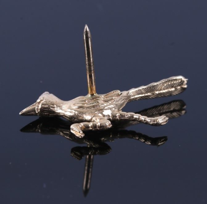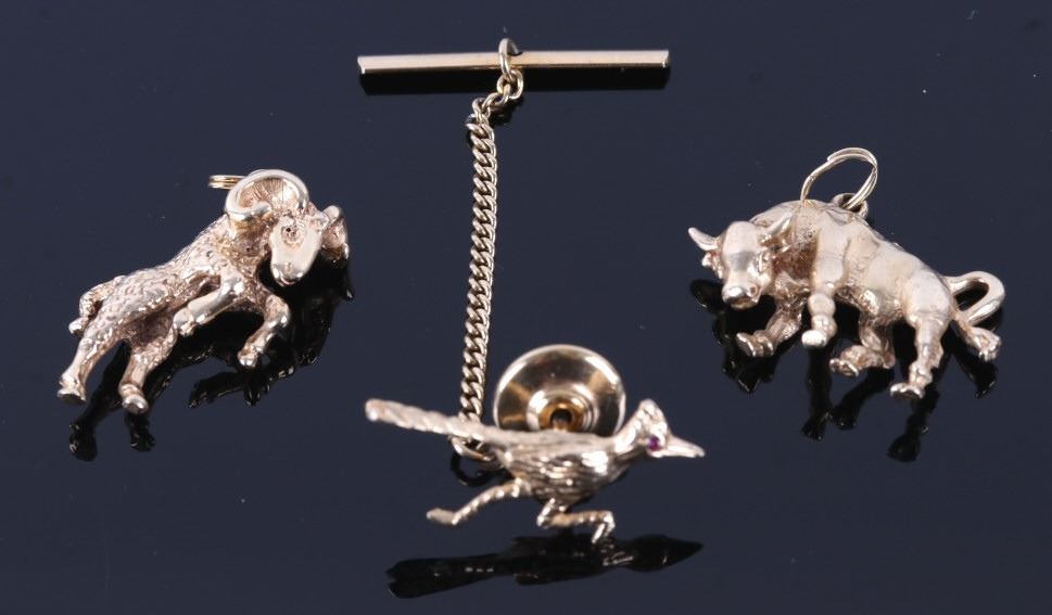 For your consideration is a collection of 14K gold tie tac and necklace pendants. The 14 carat gold tie tac features a road runner and brilliant cut ruby eye. The tie tac has a chain to be attached to a shirt button hole. The two pendants included in this lot feature a 14K bull and ram. All pieces have been tested and confirmed to be 14K solid gold. Both are in good condition and show a gorgeous warm patina. These pieces are from the early 1950's. The tie tac measures 2" long and the road runner measures 1" wide.