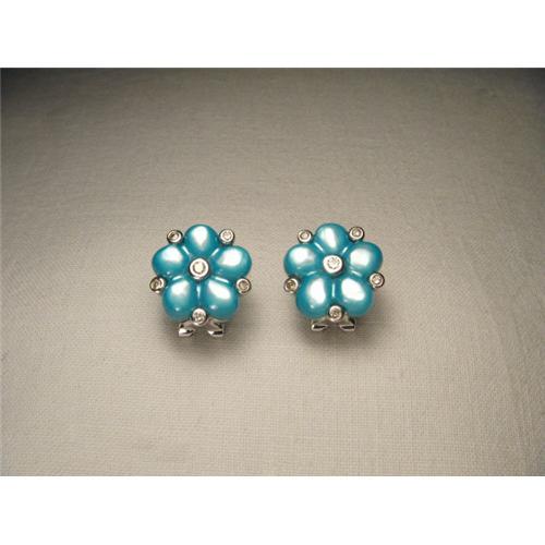 You are looking at a pair of estate 14K white gold mop pearl and diamond earrings. Each lovely piece features a turquoise color mop pearl flower measuring 12 mm across and 6 brilliant round diamonds measuring 1 mm each. Each earring measures 5/8 of an inch across. The pair weighs 6 grams. They are in mint condition.