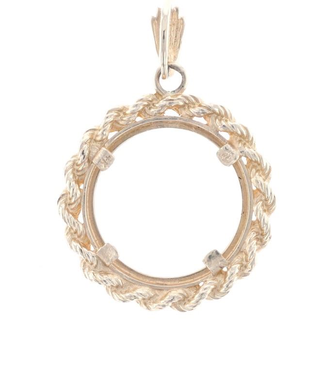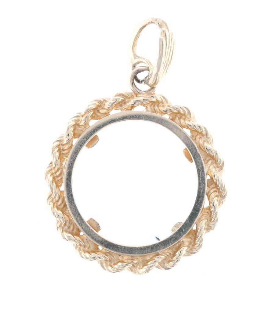 Offered in this lot is a 14k gold twisted rope coin frame/holder pendant. The pendant has four tines to hold a coin with a twisted rope frame. This pendant has a 22 mm center measurement, a 29 mm outside measurement, and 7-gram weight. This medallion coin holder is in good condition.