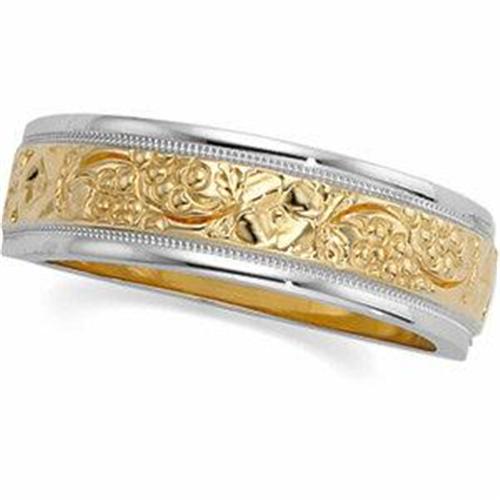 This very beautiful Wedding Band is 14K Yellow Gold with a White Gold rim either side. The Yellow Gold is beautifully Hand Engraved. This ring is a Size 7 and I do have a matching mans ring available as well.