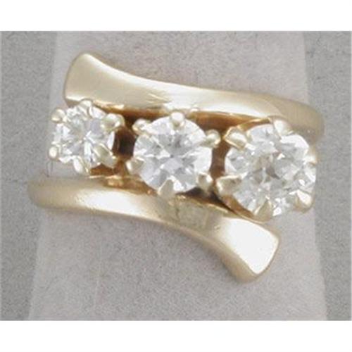 Extra Special! 3 Stone Diamond Ring. Unique 14K Gold and Diamond ring. Largest stone is and an old European cut,(5.25mm) approx 1/2 carat, middle stone modified old European cut (4.41mm)approx. 1/3 carat,3rd stone (3.73mm) almost 1/4 carat. Total carat weight approx 1.29 carats. weighs 4.7 grams and is a size 5 3/4 One stone for yesterday,one for today and one for tomorrow.