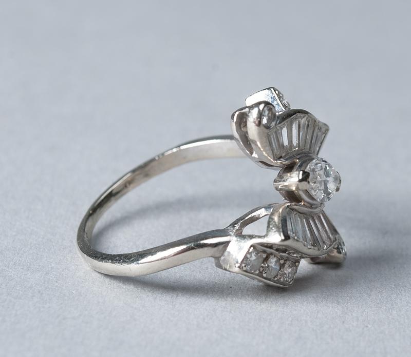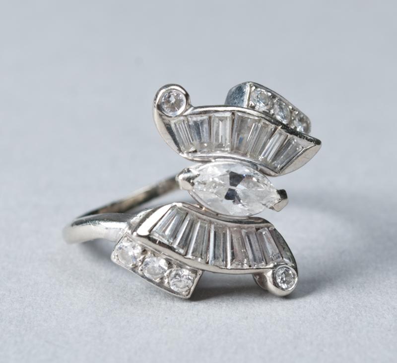 Size 7.25. Set with one marquis cut diamond weighing .41 cts., SI-1 clarity, color Gk. With eight round full cut diamonds, .22 cts, bead set. Fourteen tapered baguette and straight baguette diamonds, .60 cts, channel set, clarity grade: VS-1 to SI-2, color G to H. 4.1 grams total weight, replacement value $2700, appraisal on file.
