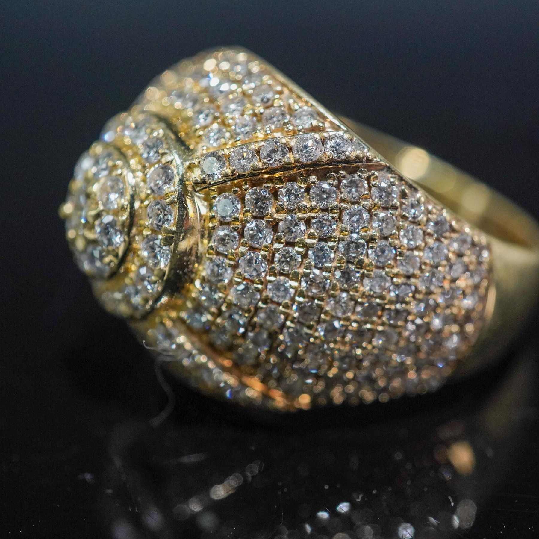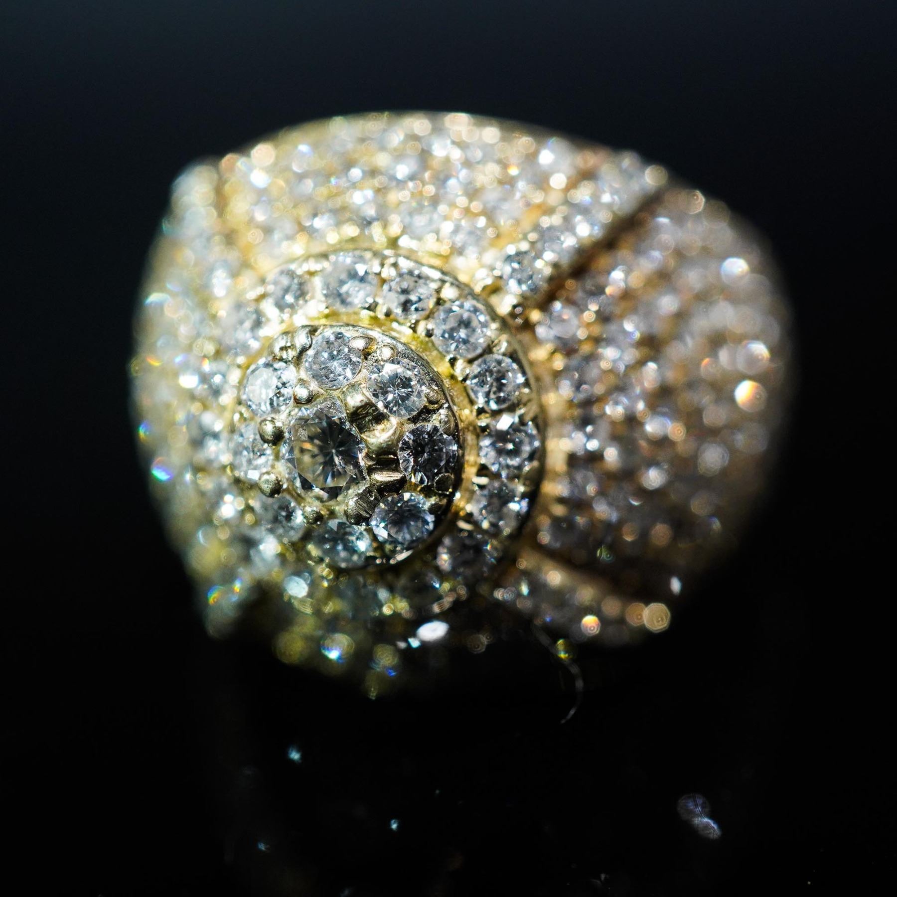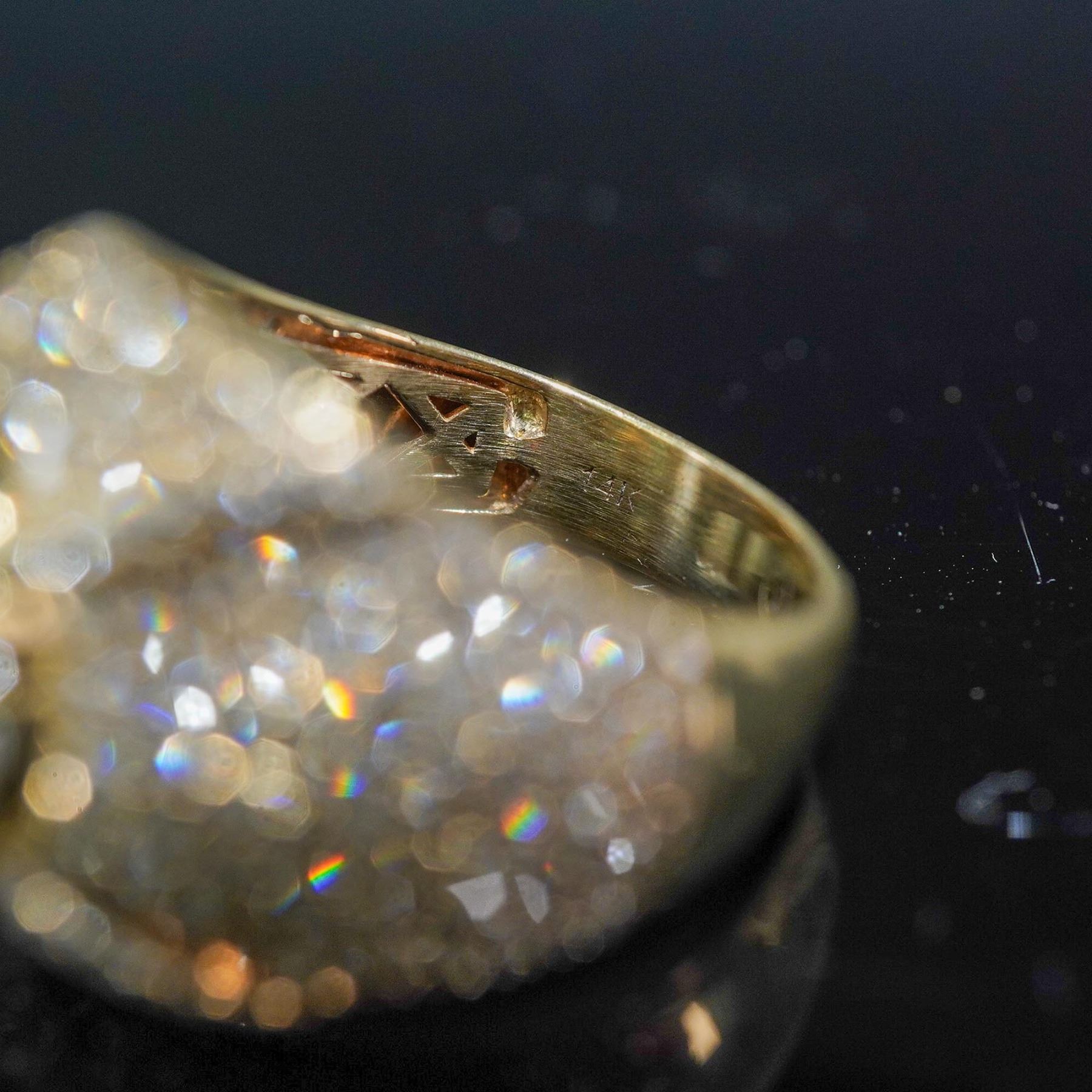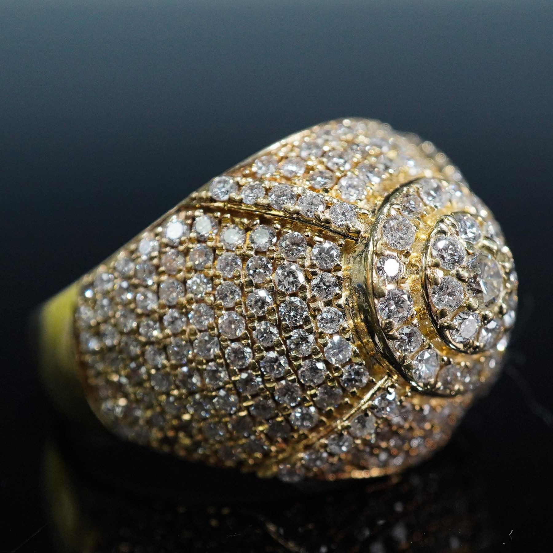 This 14kt yellow gold dome-style ring is pave-set with a total of 234 round brilliant-cut diamonds, creating a continuous surface of sparkle across the domed top. The diamonds have a combined total weight of approximately 3.75 carats, offering a bold and luxurious presentation. The ring is marked 14KT and weighs noticeably on the finger, making it an eye-catching statement piece. Ring size is US 9.5