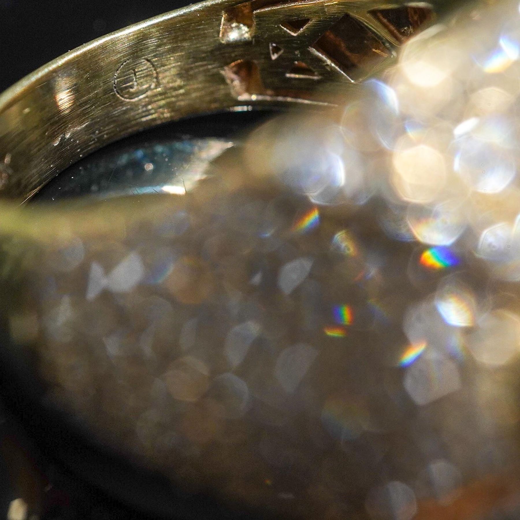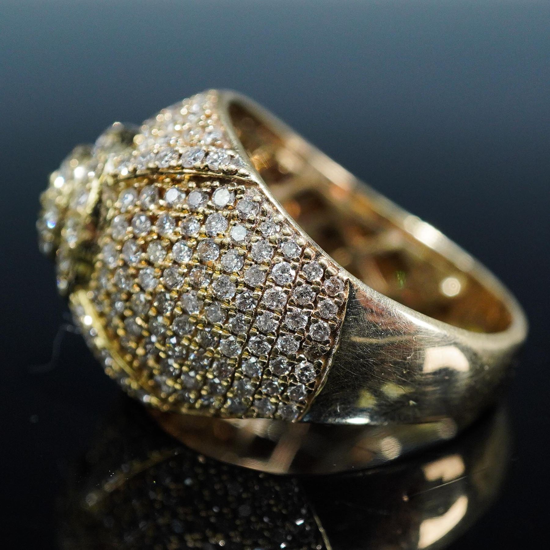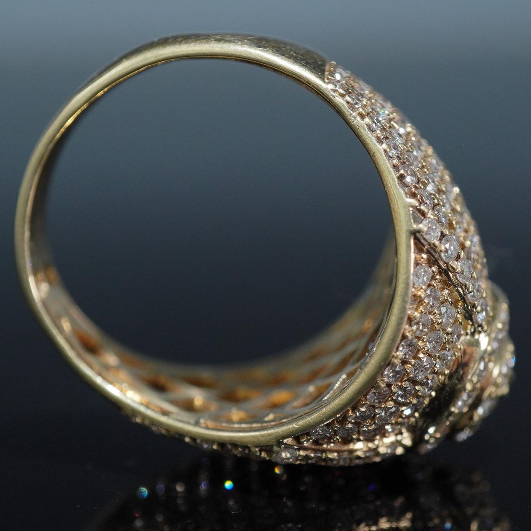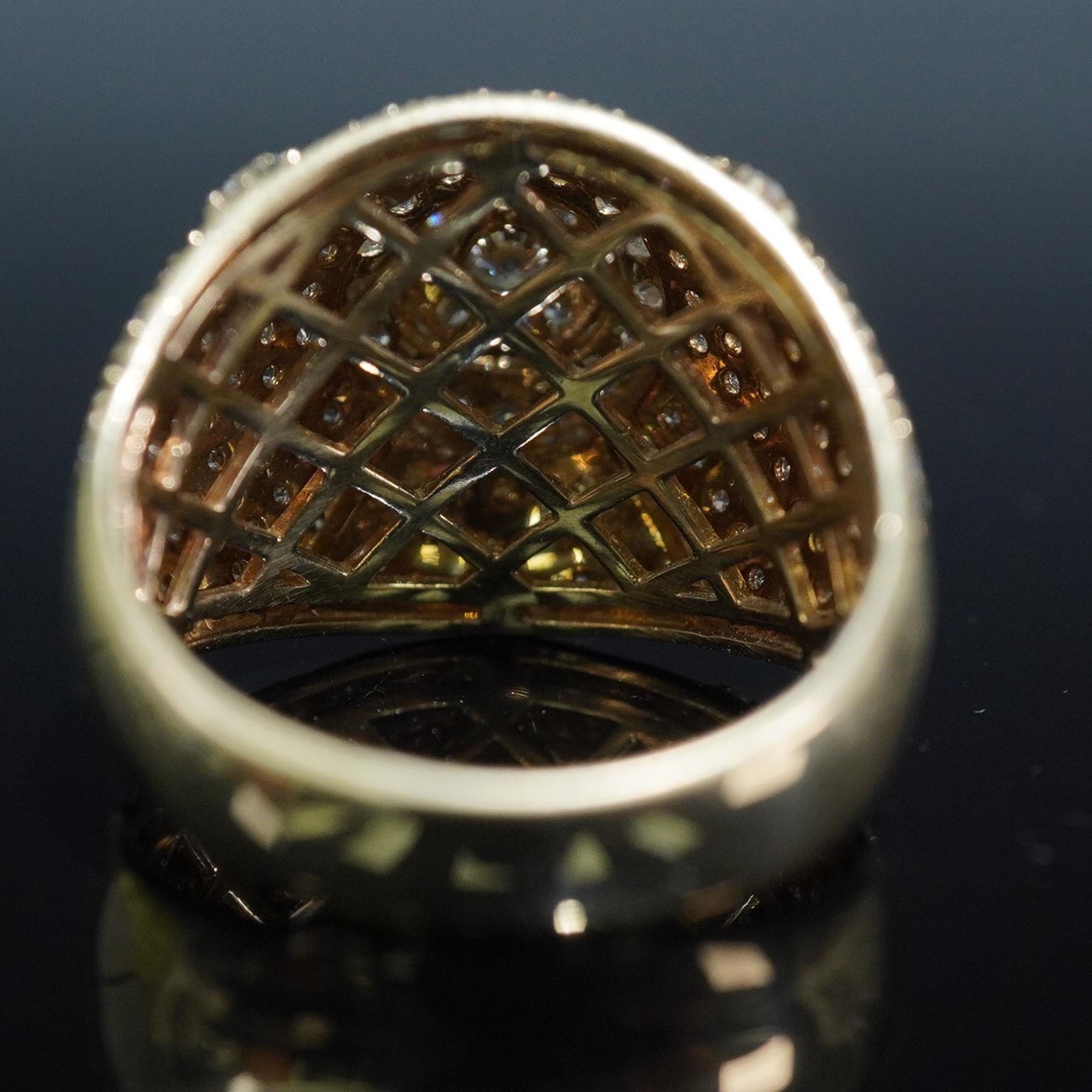 This 14kt yellow gold dome-style ring is pave-set with a total of 234 round brilliant-cut diamonds, creating a continuous surface of sparkle across the domed top. The diamonds have a combined total weight of approximately 3.75 carats, offering a bold and luxurious presentation. The ring is marked 14KT and weighs noticeably on the finger, making it an eye-catching statement piece. Ring size is US 9.5