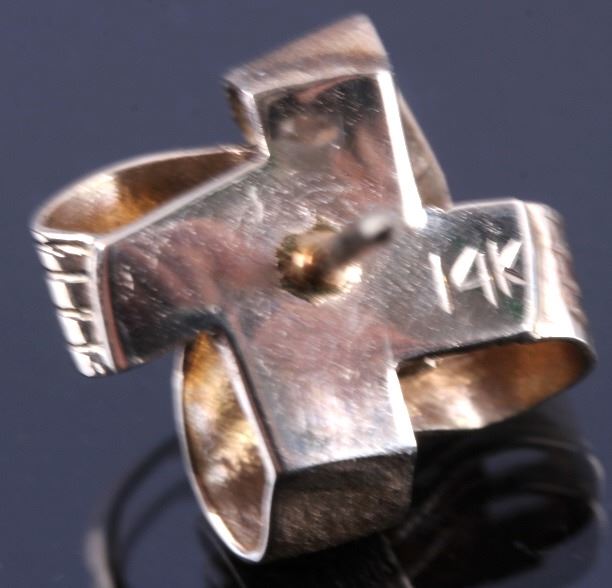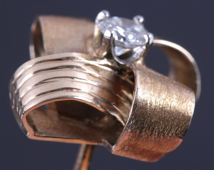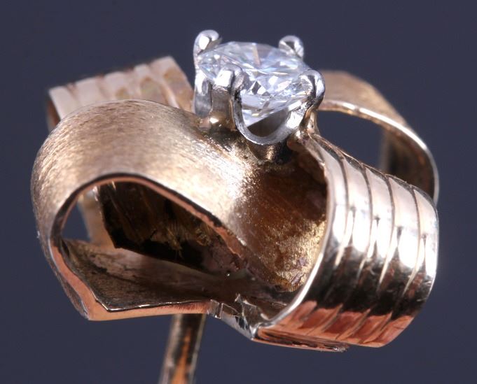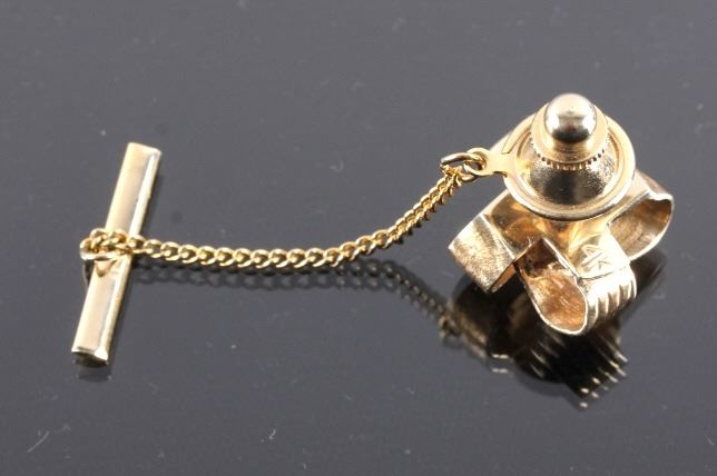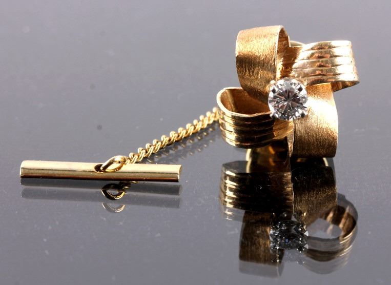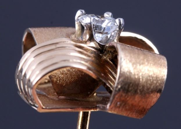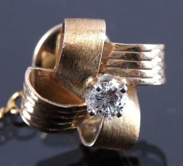 This is a 14K gold and diamond tie tack. The piece is marked "14K" on the back and features a beautiful round cut diamond. The diamond measures 4.57mm in diameter and is estimated to be approximately .35 carats. It shows excellent color and clarity. The tie tack is in good condition. The diamond does have a small chip on one side. It measures .6" x .6".