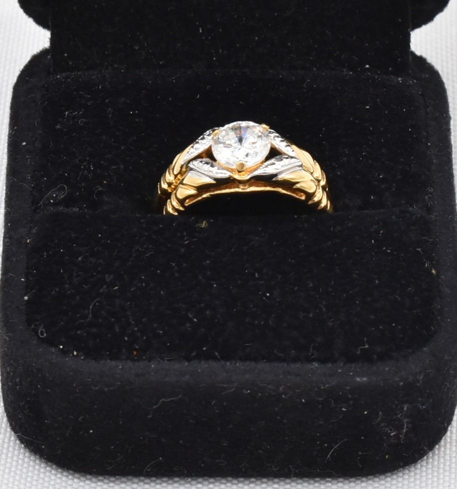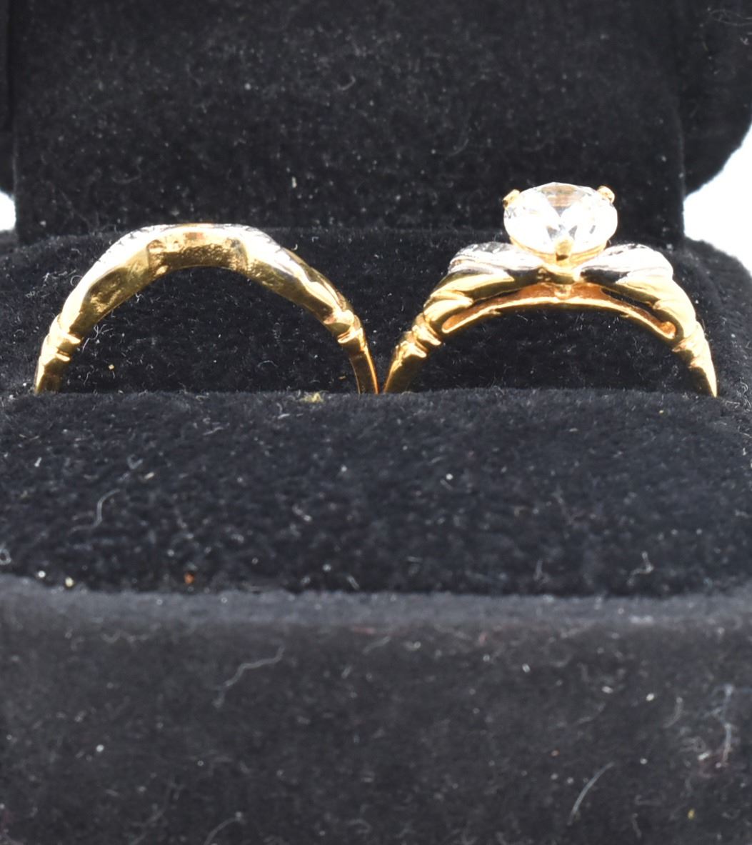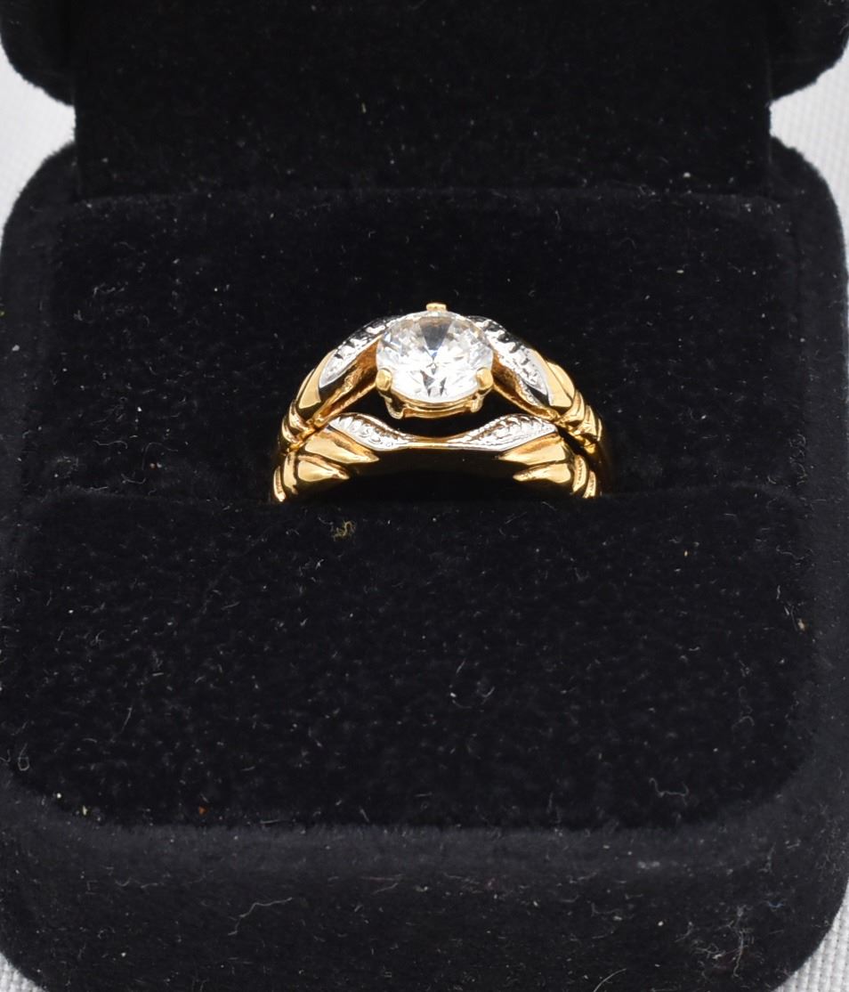 14K Heavy Gold Electroplate Wedding Set 5mm CZ Solitaire by Lind, size 6.5, very attractive wedding set by Lind, a 5mm CZ solitaire set on a silver and gold mountings, the wedding band is shaped to fit around the prong-set CZ and has the same pattern as the engagement ring, the condition is like new and likely never worn, presentation box includes, the size is 6.5 and the gram wt. is 4g, HGE means ''heavy gold electroplate'' is gold-plated jewelry