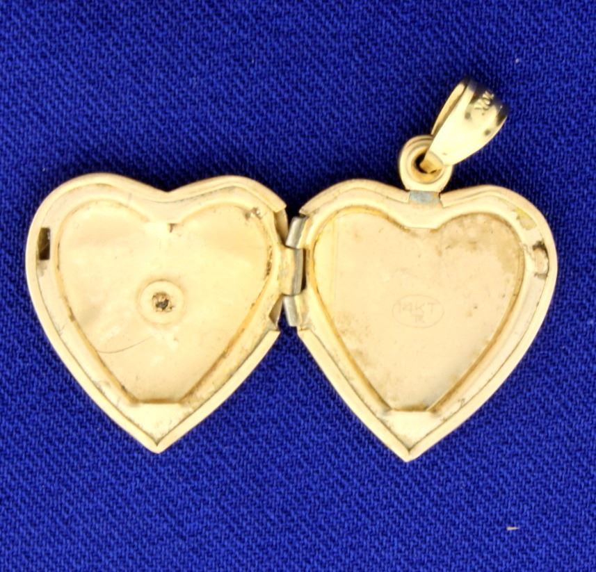 The locket is 14K yellow gold and contains one .01ct diamond on the front of locket. The front has a very slight crease/dent and is 1 inch long. 2.9g