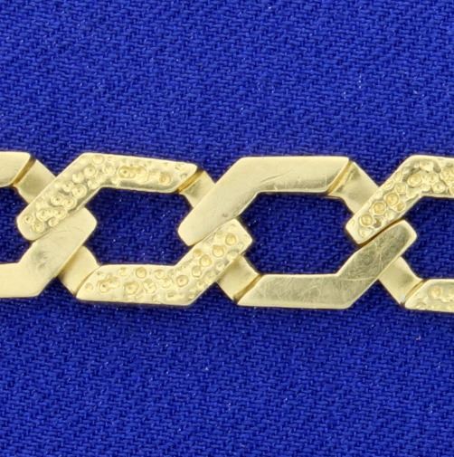 In 14K yellow gold this bracelet is 10 1/4 inches long and 9 1/2mm wide. With lobster clasp. 29.3g