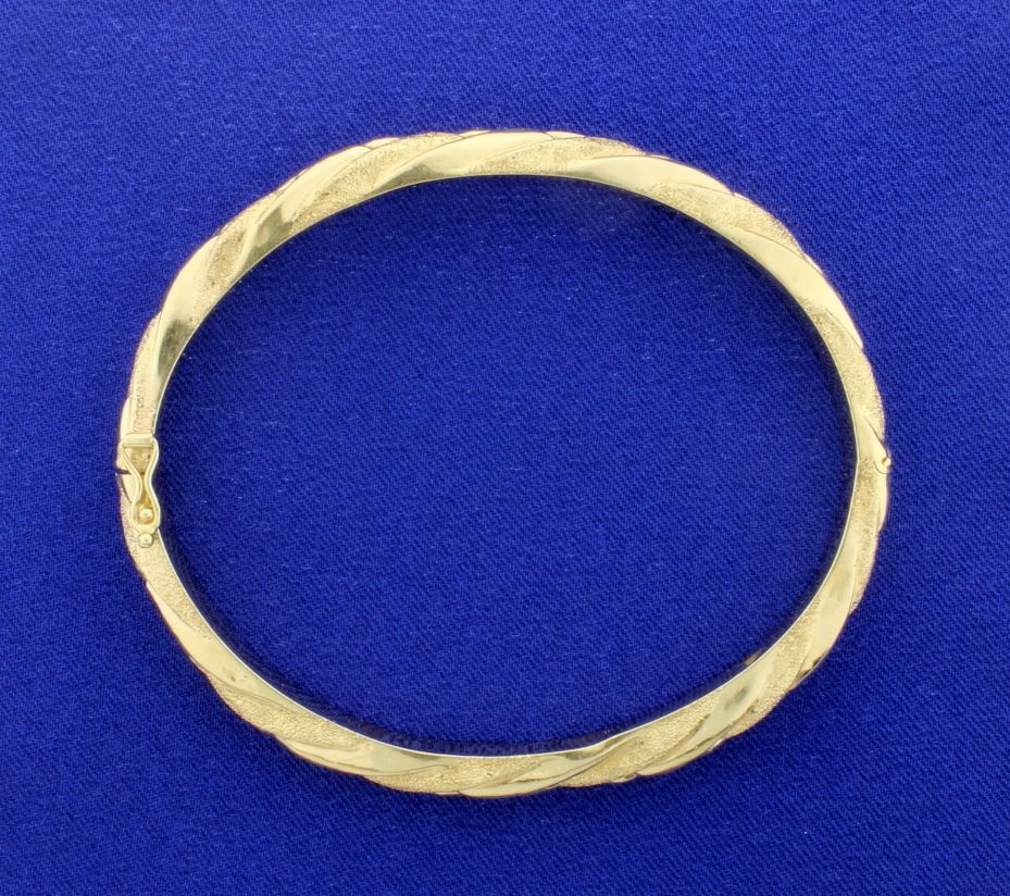 14K yellow gold, this bracelet has an inside diameter of 2 3/4 inches. It also has a safety clasp. 15.4g