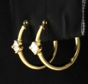 In 14K yellow gold, each earring contains a 3mm square CZ. They are 3/4 inch long, they do have a couple of minor dents in the gold that are hardly noticeable. 0.9g