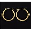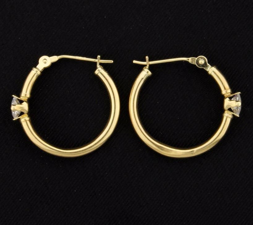 In 14K yellow gold, each earring contains a 3mm square CZ. They are 3/4 inch long, they do have a couple of minor dents in the gold that are hardly noticeable. 0.9g