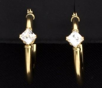 In 14K yellow gold, each earring contains a 3mm square CZ. They are 3/4 inch long, they do have a couple of minor dents in the gold that are hardly noticeable. 0.9g