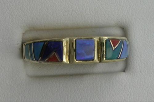 14K YELLOW GOLD OPAL, CORAL, LAPIS & TURQUOISE INLAY BAND. 4.4 GRAMS.