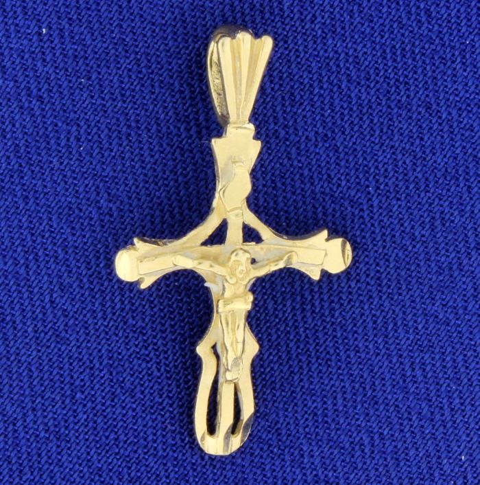 The pendant is 14K yellow gold and is 1 inch long with bale. Has great detail! 1.0g
