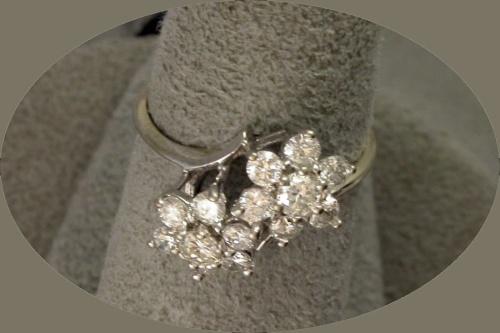 LADY'S 14 K WHITE GOLD TRUBRITE DOUBLE CLUSTER DIAMOND RIGHT-HAND RING CONTAINING FOURTEEN (14) ROUND BRILLIANT CUT DIAMONDS WEIGHING APPROXIMATELY 1 CT TOTAL WEIGHT, H-I COLOR, SI2-I1 CLARITY. 2.5 GRAMS.