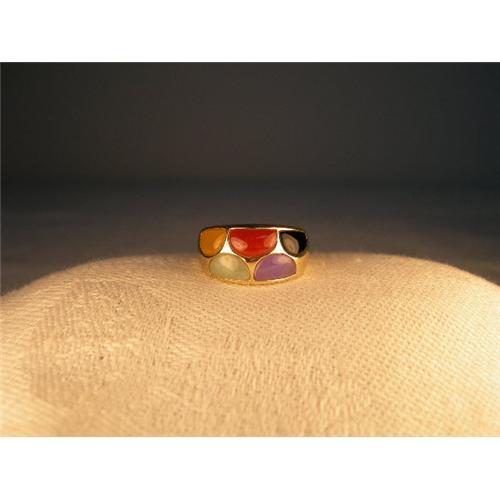 You are looking at stunning estate 14K yellow gold gemstone band. There 5 stones including green jade, lavender jade, onyx, cat's eye and carnelian. Each stone measures 8 mm long by 5 mm wide. All gemstones are natural. The top of the ring measures 3/8 of an inch wide. The ring is a size 7. Sizing is available. It weighs 5.1 grams. It is in mint condition.