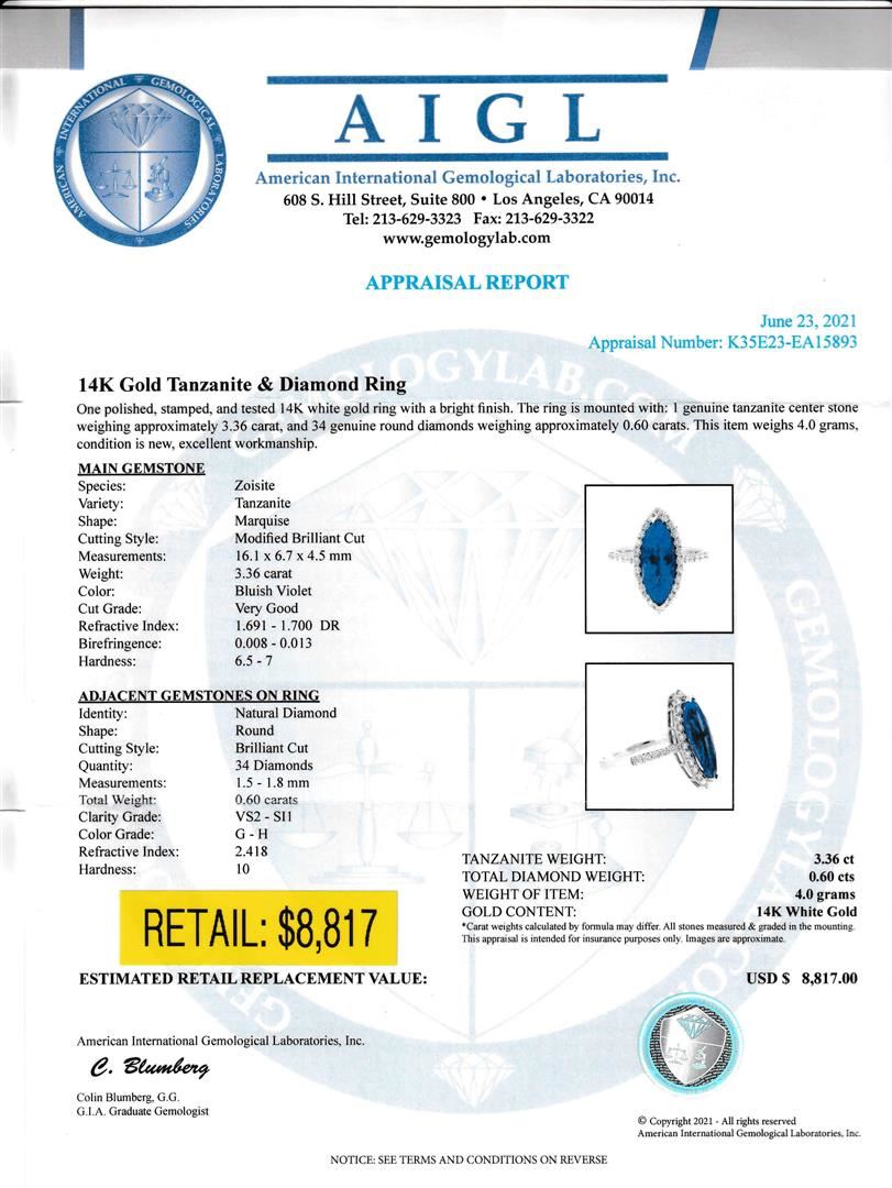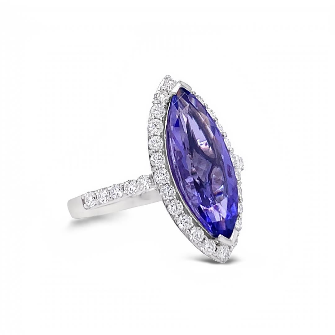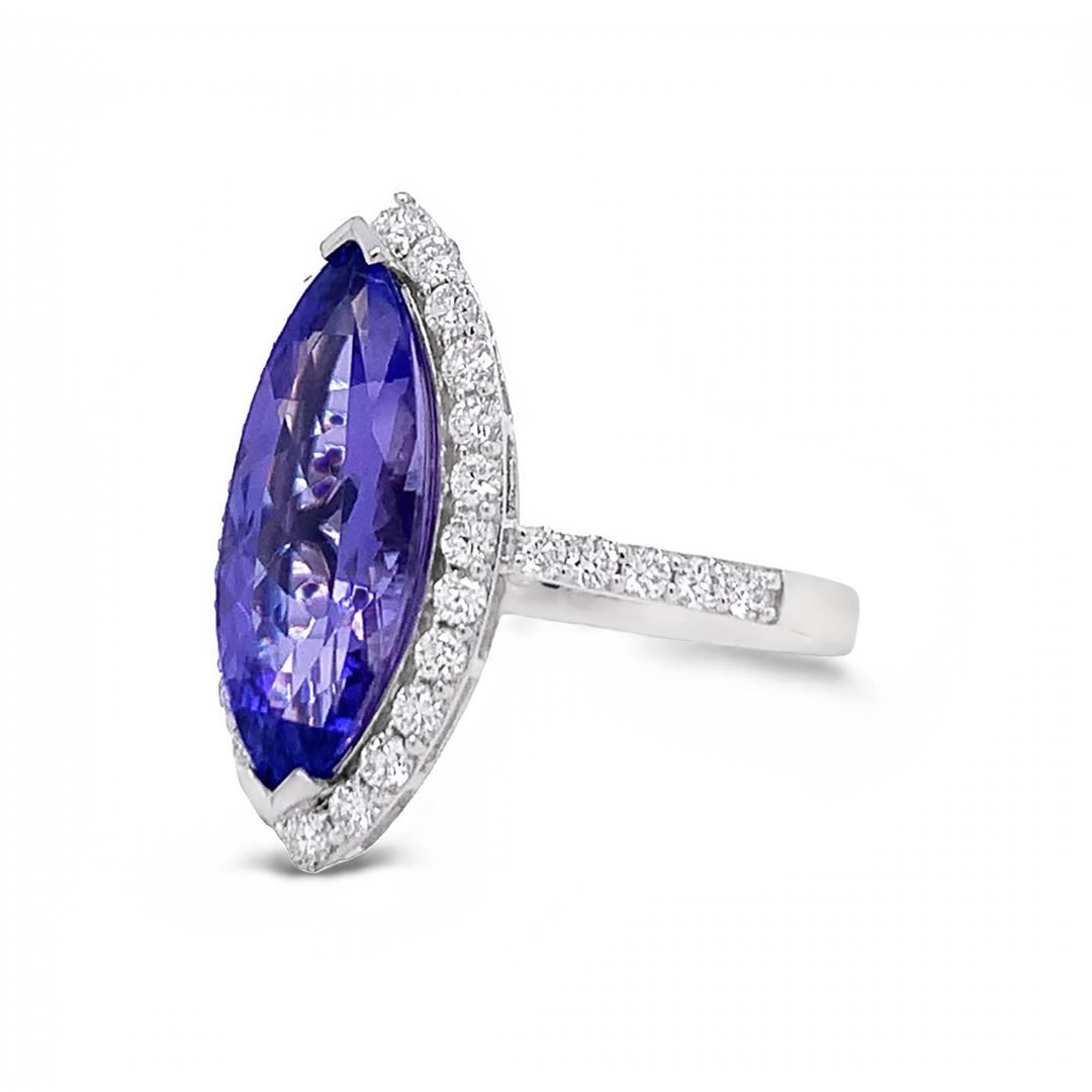 14K Marquee Tanzanite. Please see Photos and Description for all available information. This stunning tanzanite stone is accented by a row of VS diamonds, which run along the length of the pavilion on this 14K white gold ring. The marquise cut of the tanzanite stone is a unique cut that is best known for the shape it creates. A marquise cut stone has a large surface area for its size, which creates a larger appearance for the stone. This makes it a perfect stone for engagement rings.