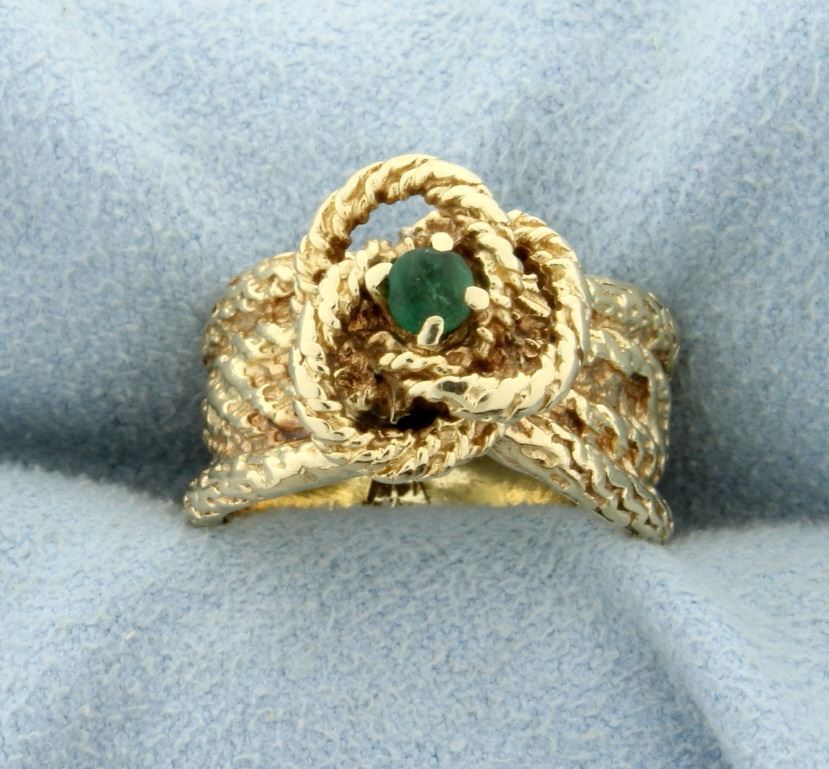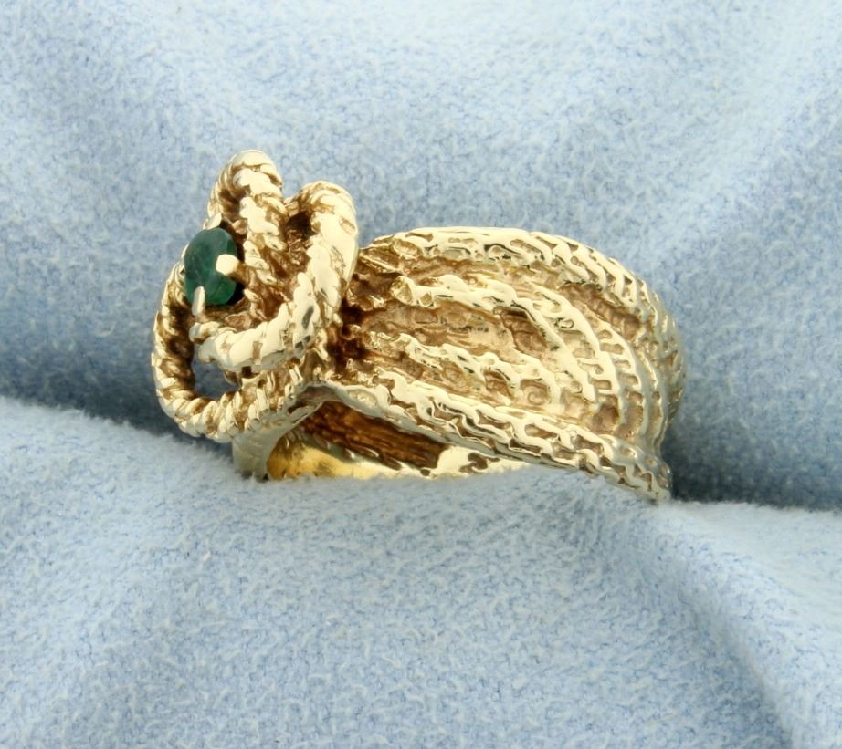 This ring is 14K yellow gold with nice detail on shank. It contains one 1/4 ct round natural emerald that has deep green color. Size 6 3/4 8.4g