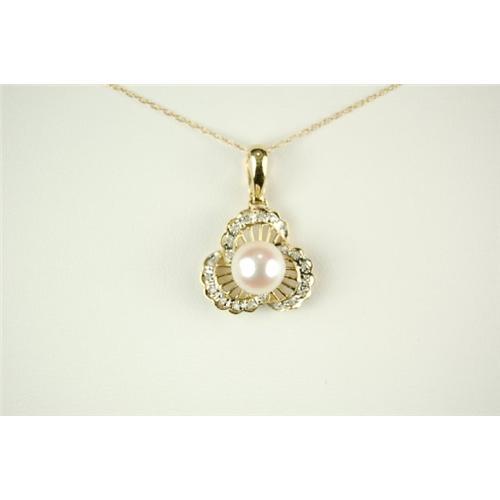 14k Yellow Gold Chain 18" long featuring a 14k Yellow Gold Pendant with a Gorgeous 9MM CULTURED PEARL surrounded by 21 DIAMONDS. This beautiful Pendant measures 3/4" across and it is ALSO a PEARL ENHANCER to be worn with your Pearls!