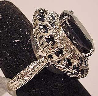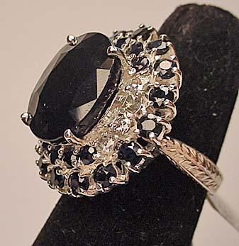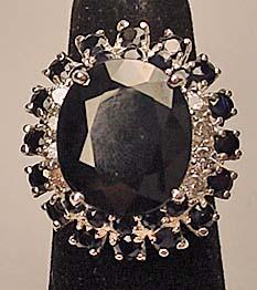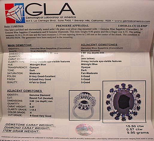 14K PLATE OVER SILVER LADIES SAPPHIRE AND DIAMOND RING - SIZE 6.75 - Comes w/ GLA Appraisal of $15,843.00. One Blue Sapphire center stone. 26 round cut Blue Sapphire adjacent stones. 8 round full cut Diamonds. Sapphire 15.50ct., Diamonds 0.57ct., Total Weight 9.90 grams.