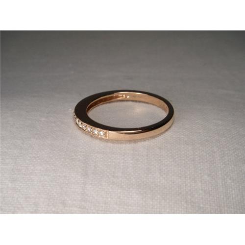 You are looking at an estate 14K pink gold eternity diamond band. This beautiful piece features 18 brillant round diamonds with a total weight of .18 of a carat, set across the front of the band. The width of the band is 1/8 of an inch. This ring is a size 7. Sizing is available. It weighs 2.3 grams. It is in mint condition.