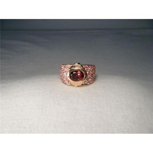 </font></strong>You are looking at an estate 14K pink gold diamond sapphire and garnet ring. This beautiful piece features one oval rhodolite garnet measuring 9 mm by 6 mm, 2 brilliant round diamonds measuring 2 mm each and 56 round pink sapphires measuring 2 mm each. The total weight of the diamonds is .12 of a carat. All gemstones are natural. The top of the ring measures 1/2 of an inch wide. It is a size 7. Sizing is avalible. This ring weighs 13.2 grams. It is in mint condition.</font>
