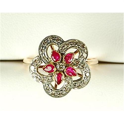 This 14k Yellow Gold ring features a flowershaped cluster of DIAMONDS and RUBYS. The Diamond Total Weight = .35 CARATS and the RUBY Total Weight = .80 CARATS. This ring is a Size 7 and it can be resized.