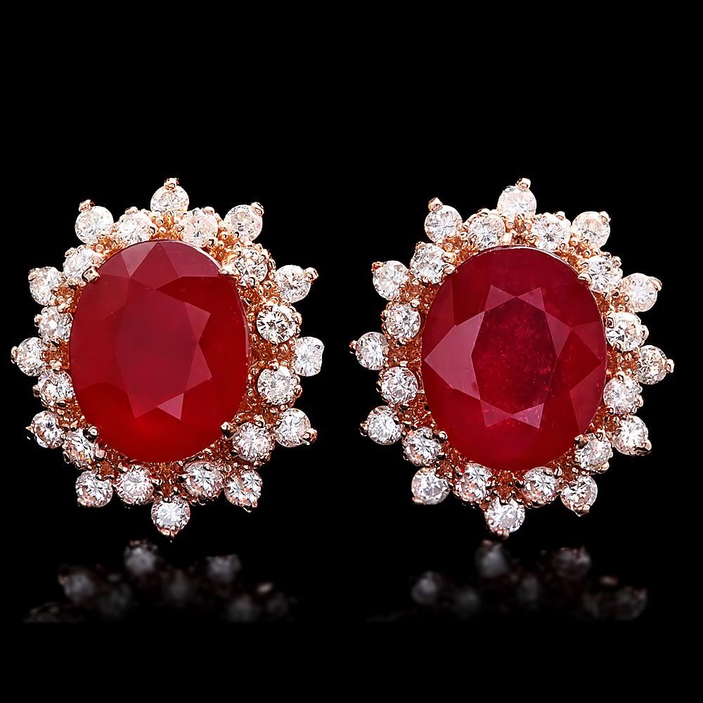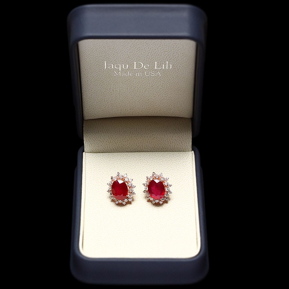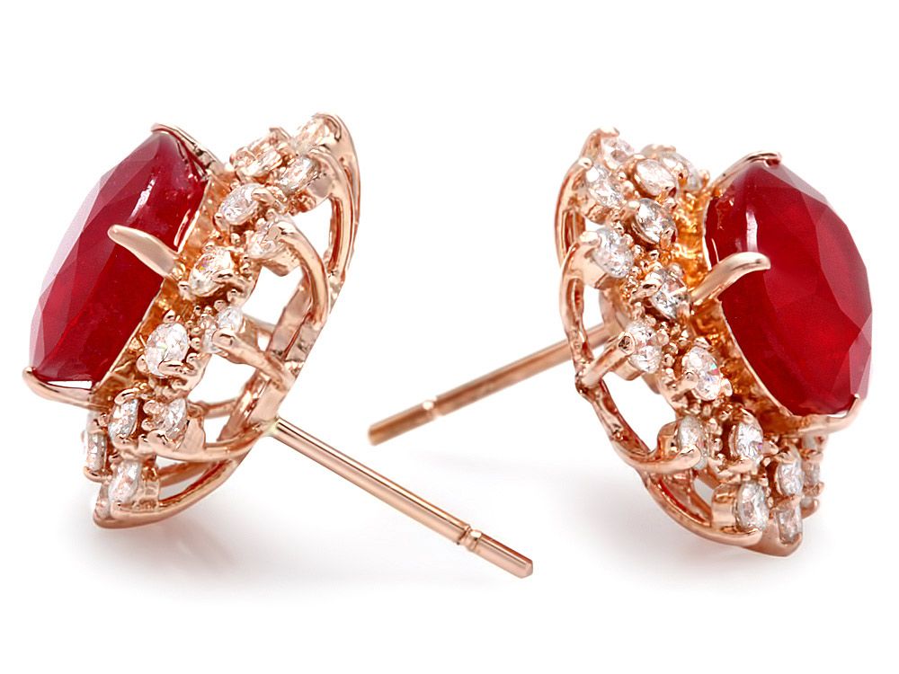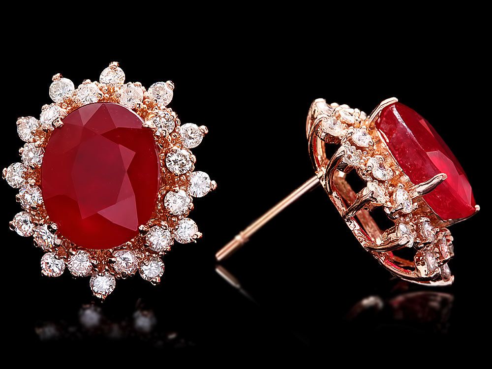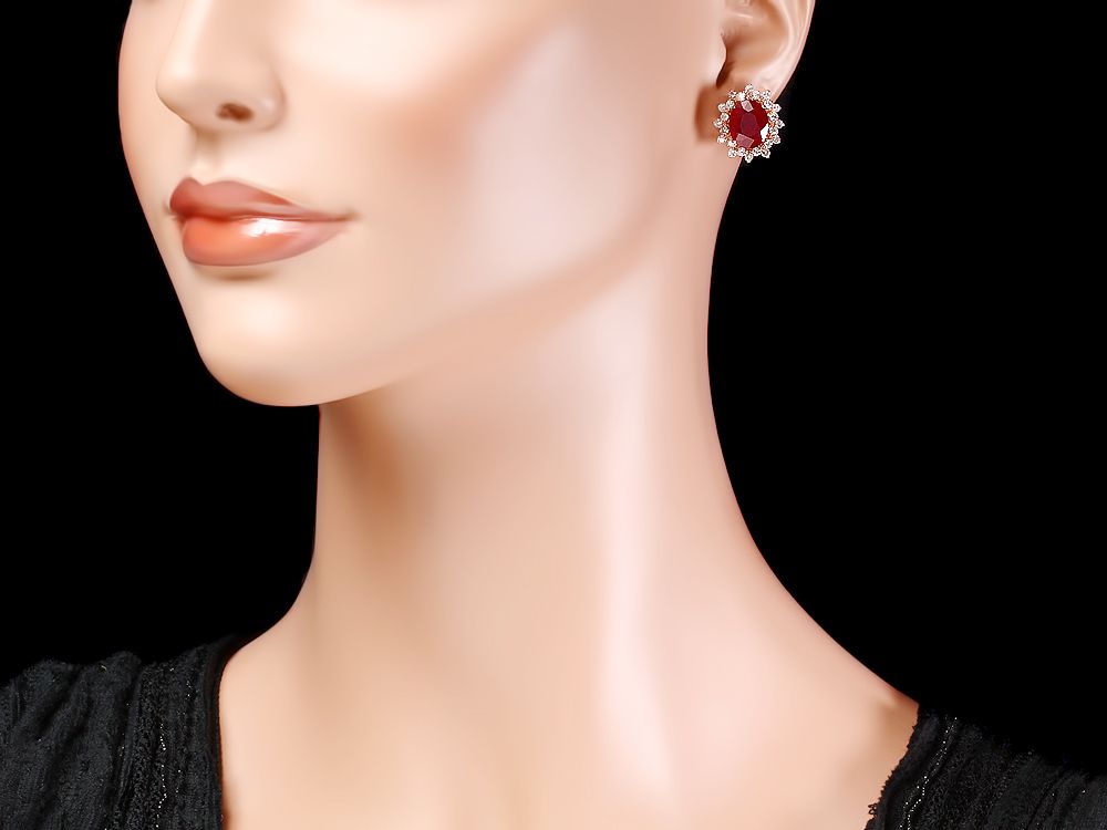 Retail: $9500.00 ****** Metal: 14k Solid Rose Gold / Total Item Weight: 6.3 grams / Country Made: USA / / Main Stone: Ruby / Color: Red / Carat Total Weight: 10.00 / Treatment: Filling / Clarity: Type 2 / Cut: Very Good / / Secondary Stone: Diamond / Carat Total Weight: 1.40 / Treatment: None / Color Grade: H - I / Clarity: SI1 - SI2 / Cut: Very Good / ****** Ref: JQL-ER-7609
