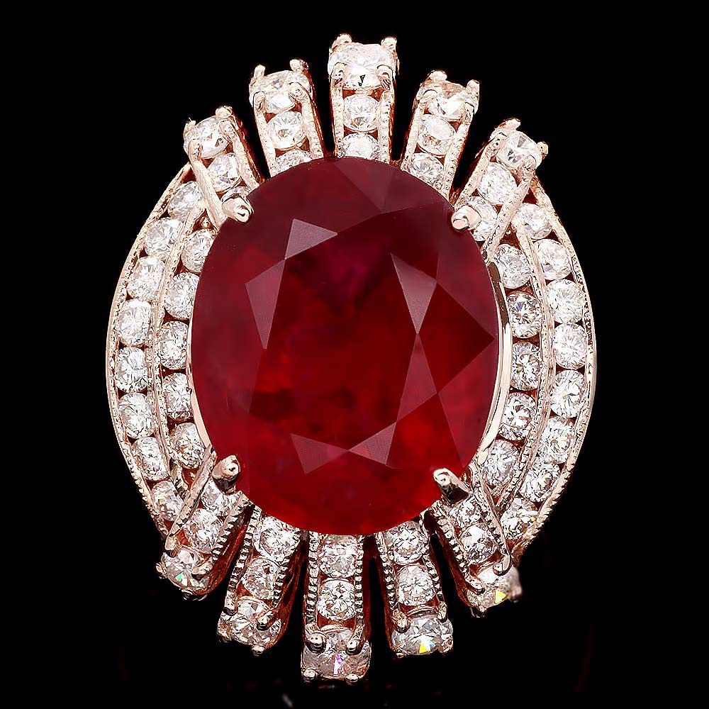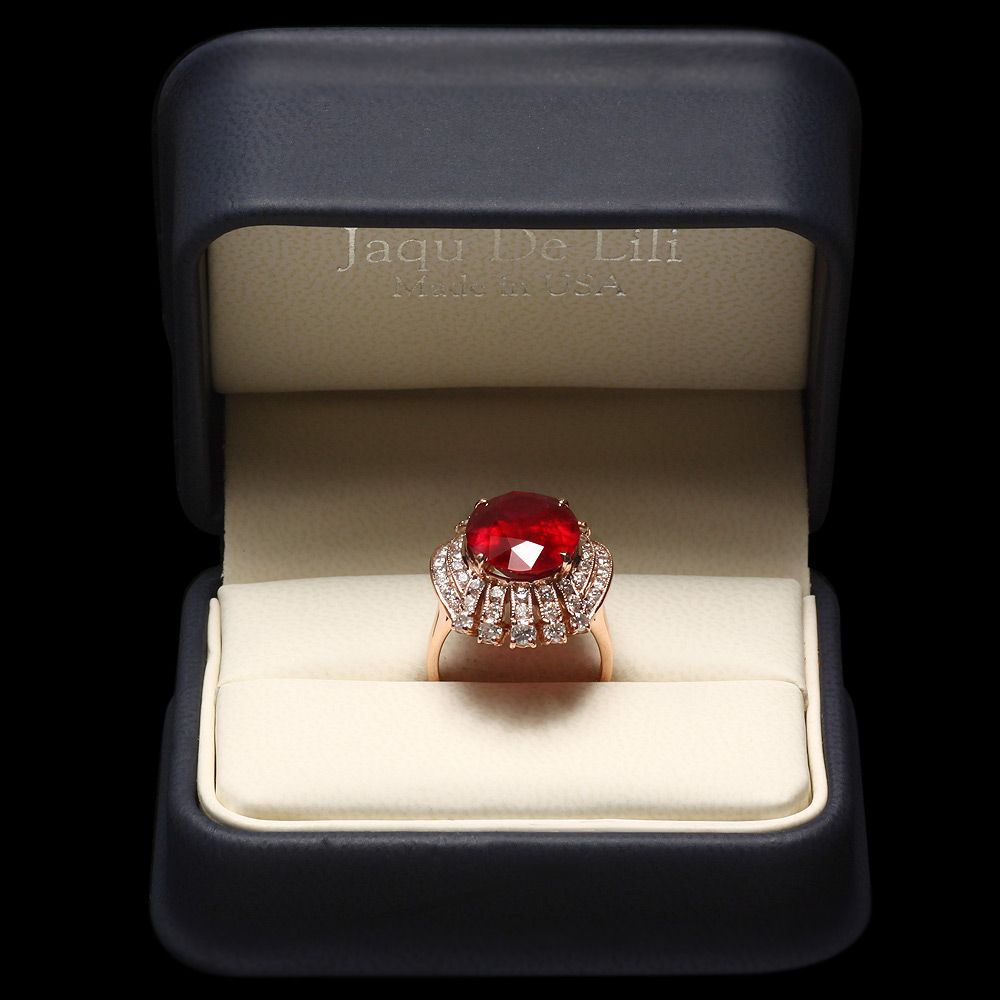 Retail: $12450.00 ****** Metal: 14k Solid Rose Gold / Size: 7 / Total Item Weight: 9.0 grams / Country Made: USA / / Main Stone: Ruby / Color: Red / Carat Total Weight: 10.00 / Treatment: Filling / Clarity: Type 2 / Cut: Very Good / / Secondary Stone: Diamond / Carat Total Weight: 1.85 / Treatment: None / Color Grade: G - H / Clarity: SI1 - SI2 / Cut: Very Good / ****** Ref: JQL-R-6667