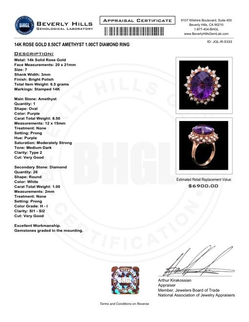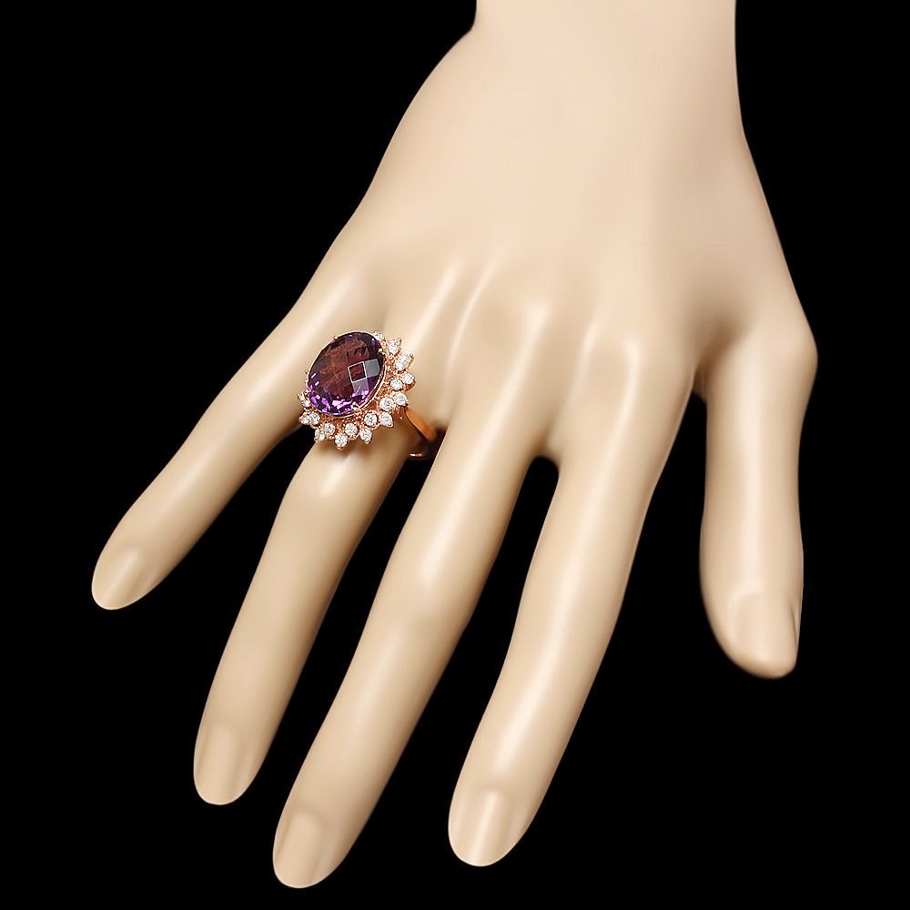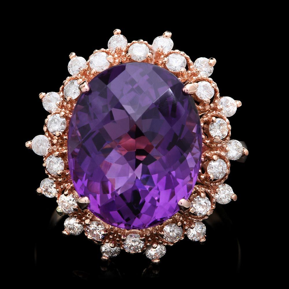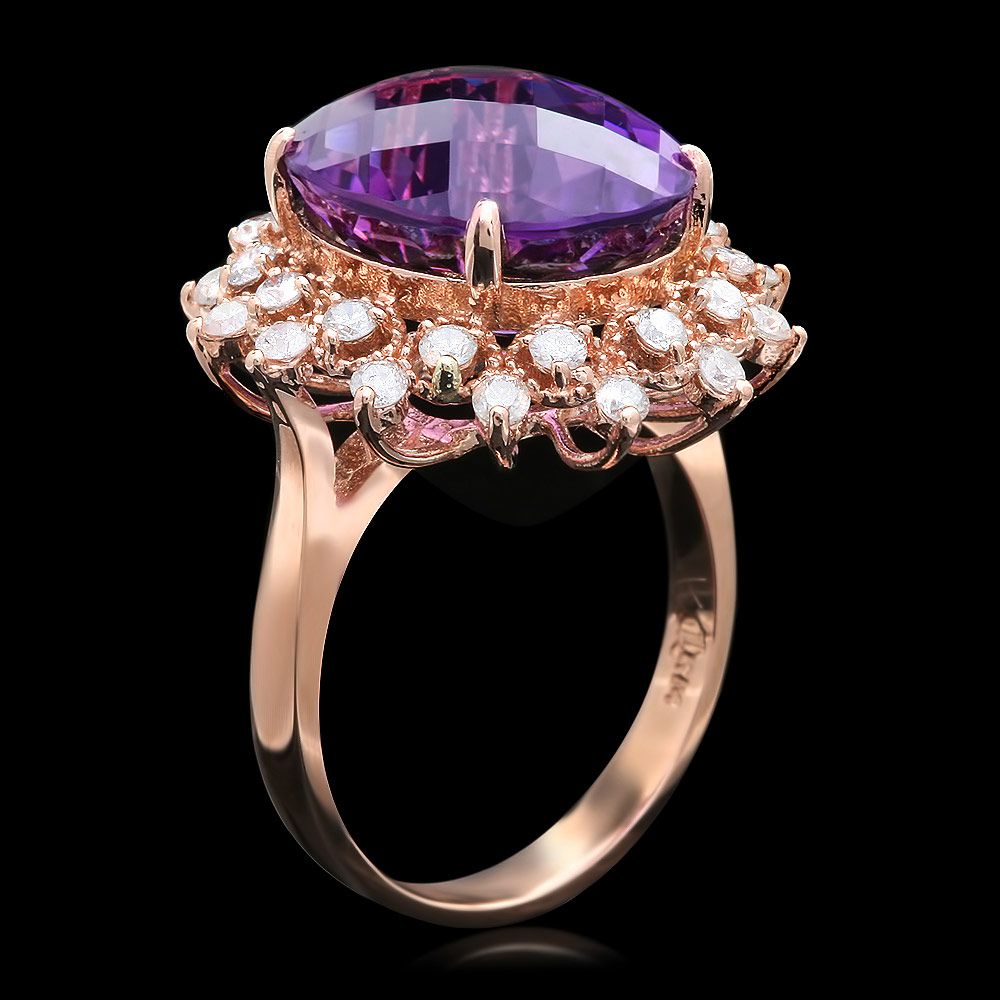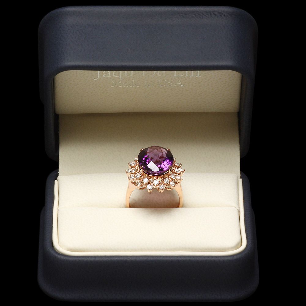 Retail: $6900.00 ****** Metal: 14k Solid Rose Gold / Size: 7 / Total Item Weight: 6.5 grams / Country Made: USA / / Main Stone: Amethyst / Color: Purple / Carat Total Weight: 8.50 / Treatment: None / Clarity: Type 2 / Cut: Very Good / / Secondary Stone: Diamond / Carat Total Weight: 1.00 / Treatment: None / Color Grade: H - I / Clarity: SI1 - SI2 / Cut: Very Good / ****** Ref: JQL-R-5333