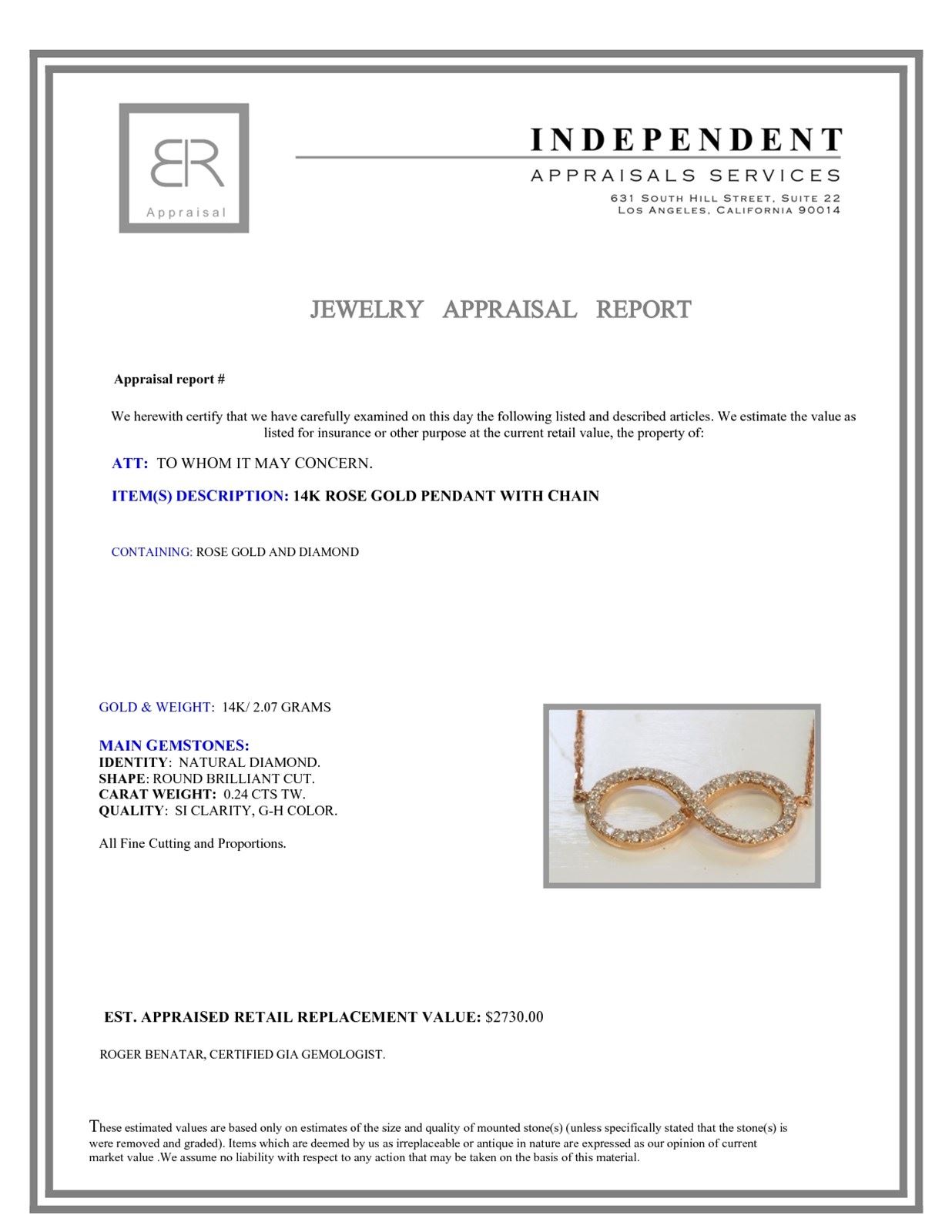 14K ROSE GOLD PENDANT WITH CHAIN :2.07g/Diamond:0.24ct