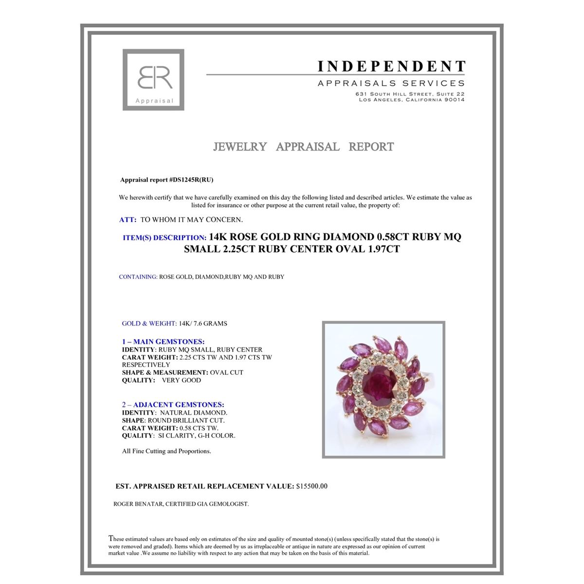 14K ROSE GOLD RING 7.6GRAM DIAMOND 0.58CT RUBY MQ SMALL 2.25CT RUBY CENTER OVAL 1.97CT