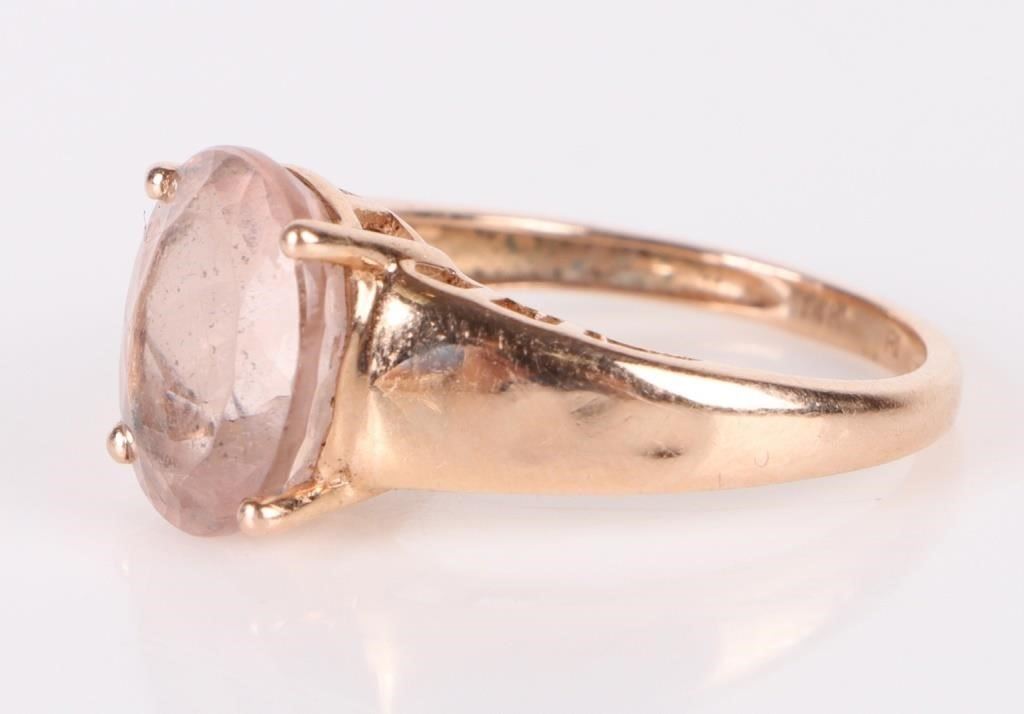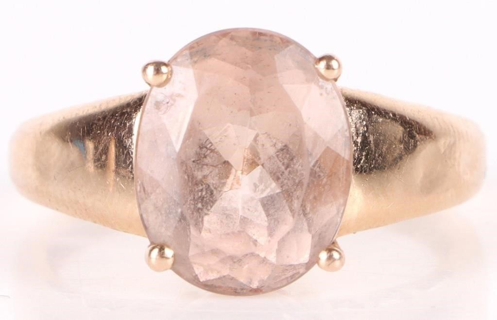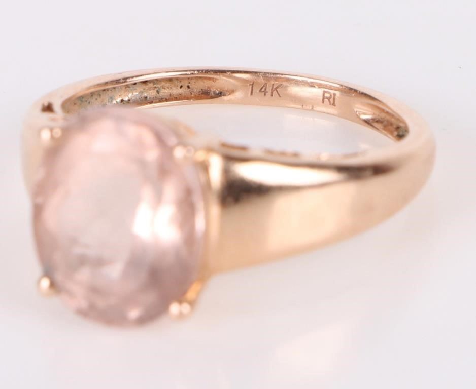 14K rose gold rose quartz ladies ring to include one 3.00ct oval cut rose quartz.