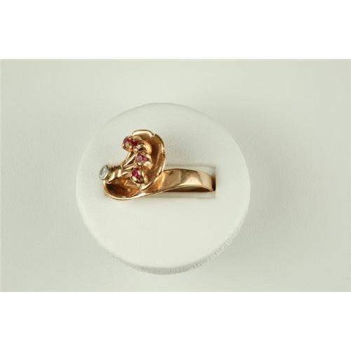 This Vintage Ring is Circa 1940 and features 14K ROSE GOLD in a wonderful scroll design that is very typical of the period. There are 4 Genuine RUBYS set at the end of a flower stem that is held by a .03 Carat DIAMOND set in White Gold. This ring is 3/4" wide across and 9/16" in height. It is a Size 6 1/2 - 6 3/4 and it can be resized. It is a charming and subdued example of this period and it is in Excellent condition.