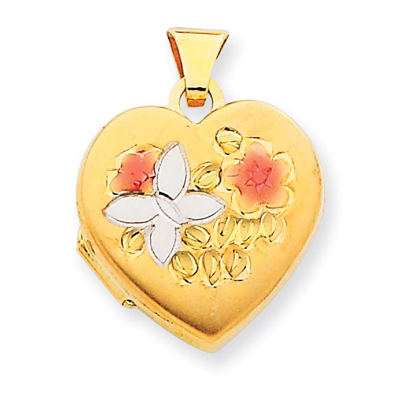 14k & Rhodium Enameled Butterfly & Flowers 15mm Heart Locket