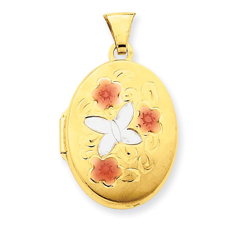 14k & Rhodium Enameled Butterfly & Flowers 21mm Oval Locket