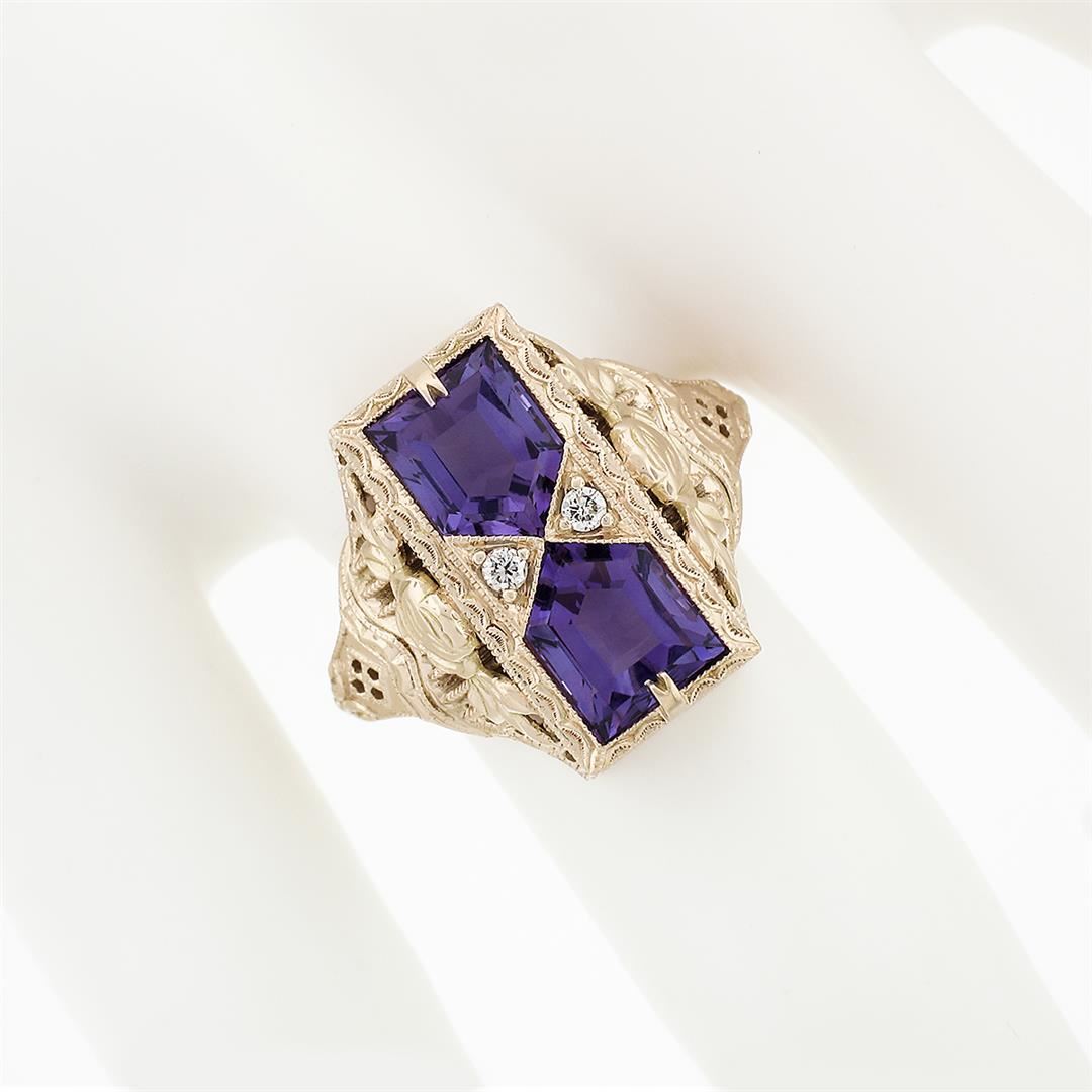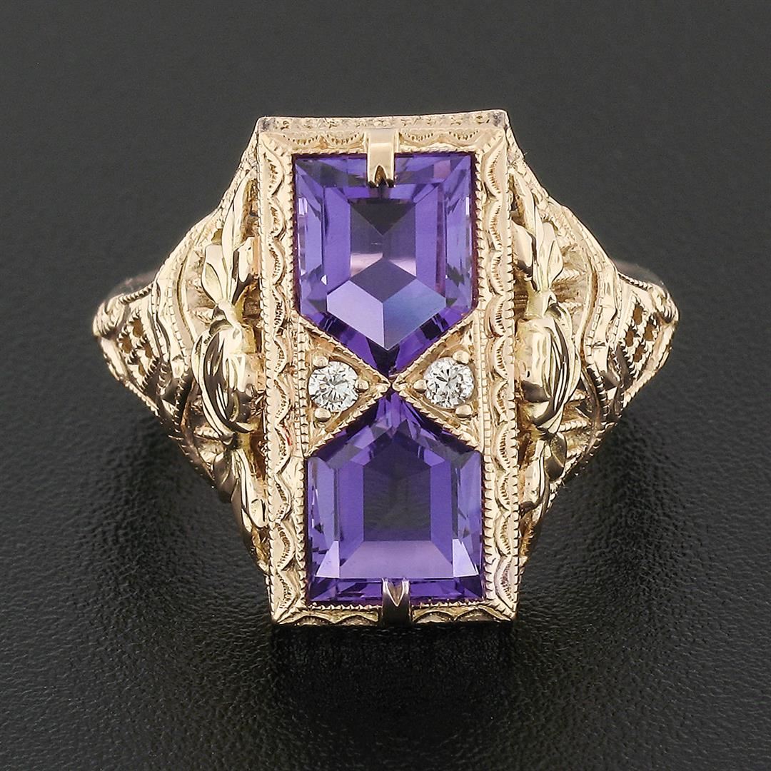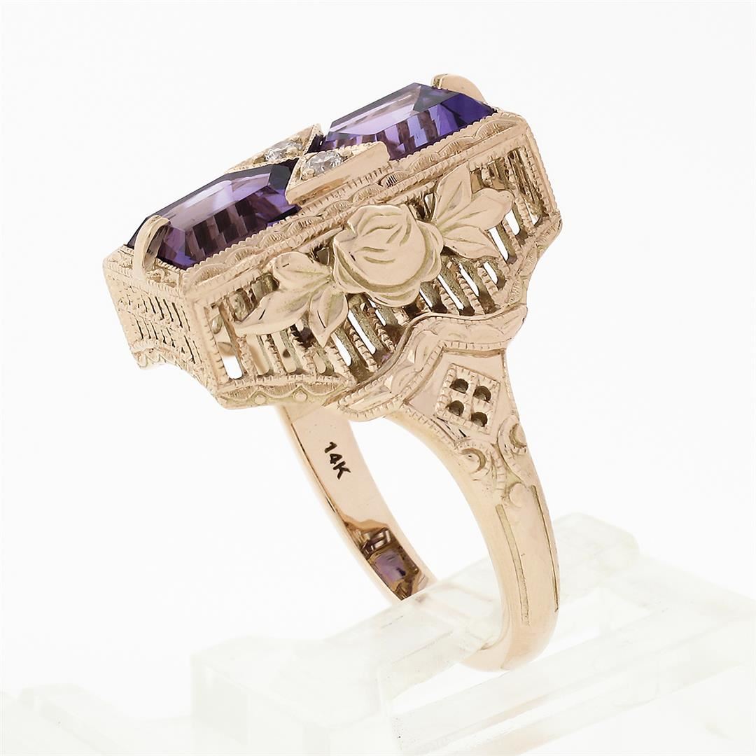 A new solid 14k rose gold platter ring, with 2 custom cut natural amethysts (1.76ctw), & 2 round brilliant cut natural diamonds (G- VS2 ; 0.04ctw). The ring is size 6.5, weighs a total of 6.25 grams, and measures 17.2mm wide.
