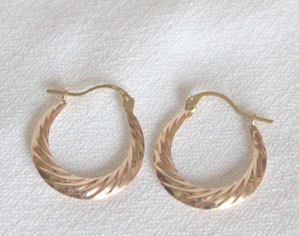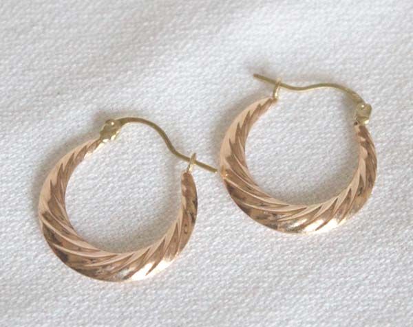 14K Rose Gold Hoop Earrings, measures 7/8''L x .75''D, carved swirl designs, stamped 14Kt, 1.4g in total wt.
