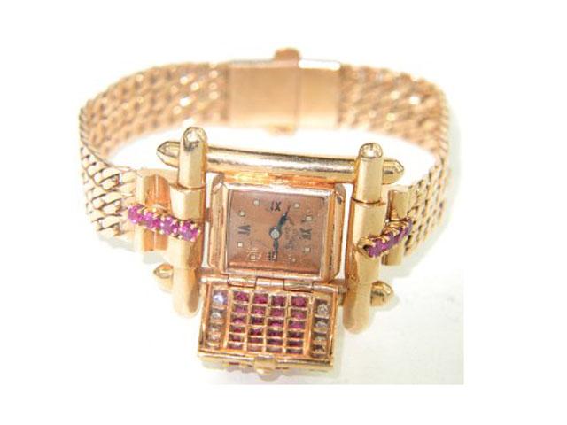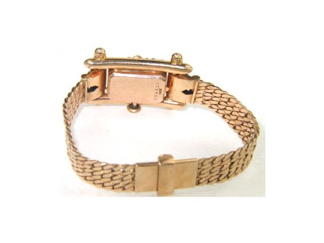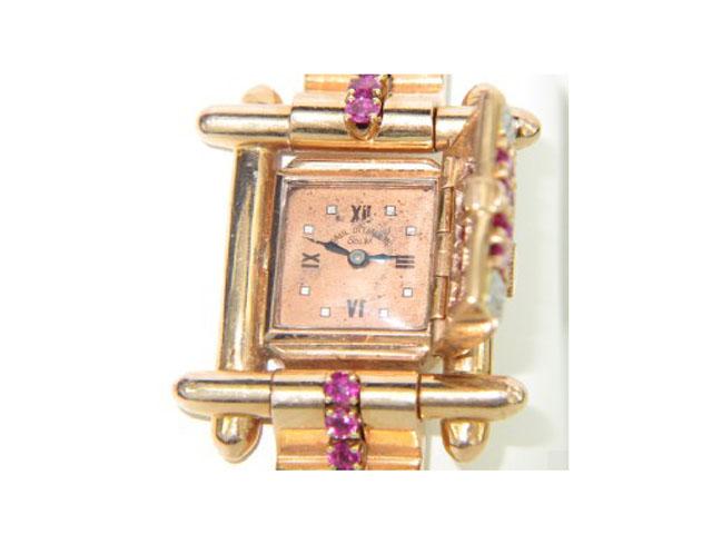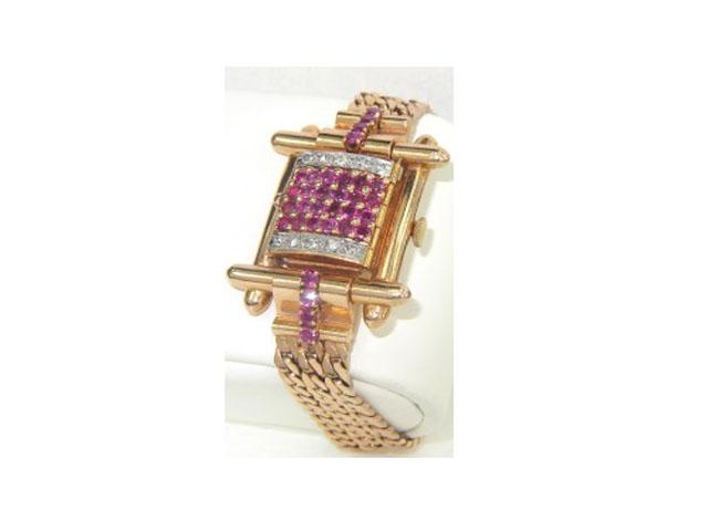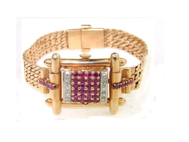 14K Rose Gold Ruby & Diamond Watch From 1950. The total watch's weight is 43.1 grams. The measurements of watch head is 16 x 14 mm and 9 mm thick. The total weight of Ruby: 2 cts. approximately. The total weight of Diamond: 0.5 cts. approximately. H color, VS - SI clarity. The length of watch: 6.25". swiss made. Chain is 9 mm wide.