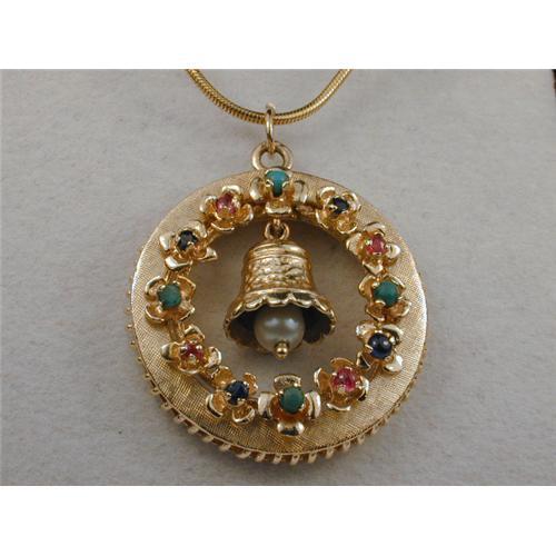 You are looking at an estate 14K yellow gold pendant with genuine gemstones. There are 4 turquoises, 4 sapphires and 4 rubies each set in a gold flower. The pearl is hanging from the bell in the center of the wreath and measures 1/2 an inch long by 3/8 of an inch wide. The pendant measures 1.25 inches in diameter. It weighs 12.4 grams. There will be a 10% restocking fee charged in case of a return.