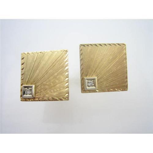 I believe that this pair of 14K SOLID GOLD Cufflinks are Circa 1950. They are Square in shape with engraving and a 'sunray' radiating from the .03 CT. DIAMOND. The Cufflinks arre edged in a 'slash' pattern for added drama. They have a maker's mark for "Chicago Case Mfg. Co.". The Cufflinks have flip back styling and they are in Excellent condition.