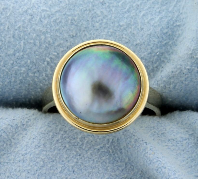 In 14K yellow gold there is a 11 1/2mm silver pearl with great color & luster. Size 7 4.0g