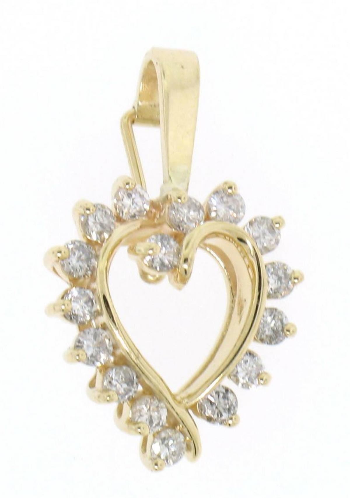 One 14K Solid Yellow Gold 1.0 CTW 16 Round Diamond Offset Heart Enhancer Pendant . Item Details : Material: 14K Solid Yellow Gold , Weight: 3.80 Grams , Stone: (16) Natural Genuine Round Brilliant Cut White Diamonds - 1.00ctw - Clarity: SI1 - Color: G/H, Dimensions/Size: Pendant measures 15.22 mm Side to Side X 17.69 mm Top to Bottom (26.55 mm Top to Bottom if you include the long enhancer bale) , Chain: This pendant does not come with a chain. However, for a small additional charge we can provide a matching 14K Solid Yellow Gold cable link chain in either 16" or 18". If that is of interest to you please message us and we will adjust the pricing to include the matching chain in the length of your choice. , Condition: Like New
