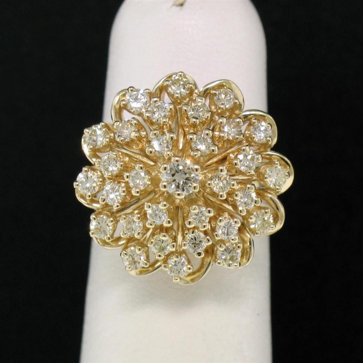 One Like NEW 14K Solid Yellow Gold Ladies Flower Ring With 31 Diamonds 1.01 Carat. Item Details: Material: 14K Solid Yellow Gold, Weight: 8.5 Grams, Stone(s): (31) Natural Genuine Diamonds - Round Brilliant Cut - Prong Set - F Color - VS1/VS2 Clarity, Total Carat Weight: 1.01 (approx.), Ring Size: 5 (We can custom size this ring.), Ring Width: 18.36 mm, Ring Height: 13.83 mm rise off the finger, Condition: Like NEW!
