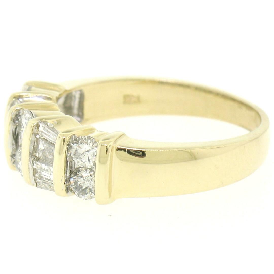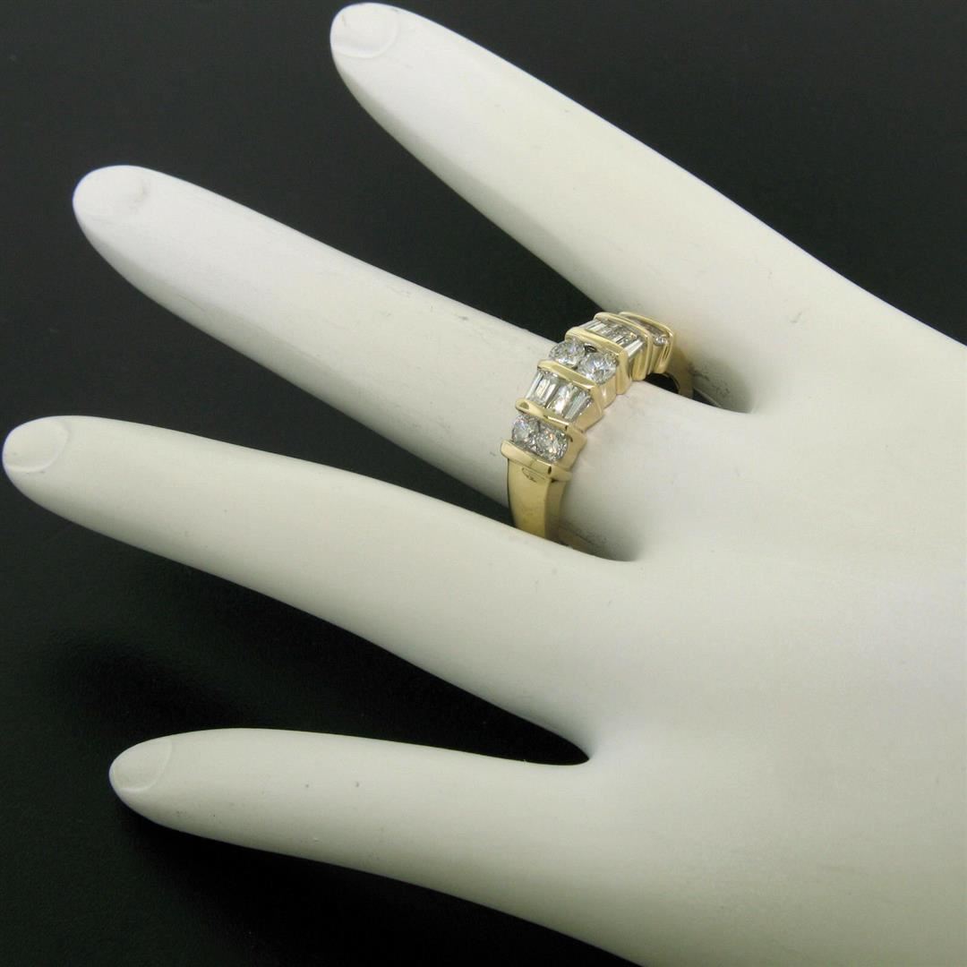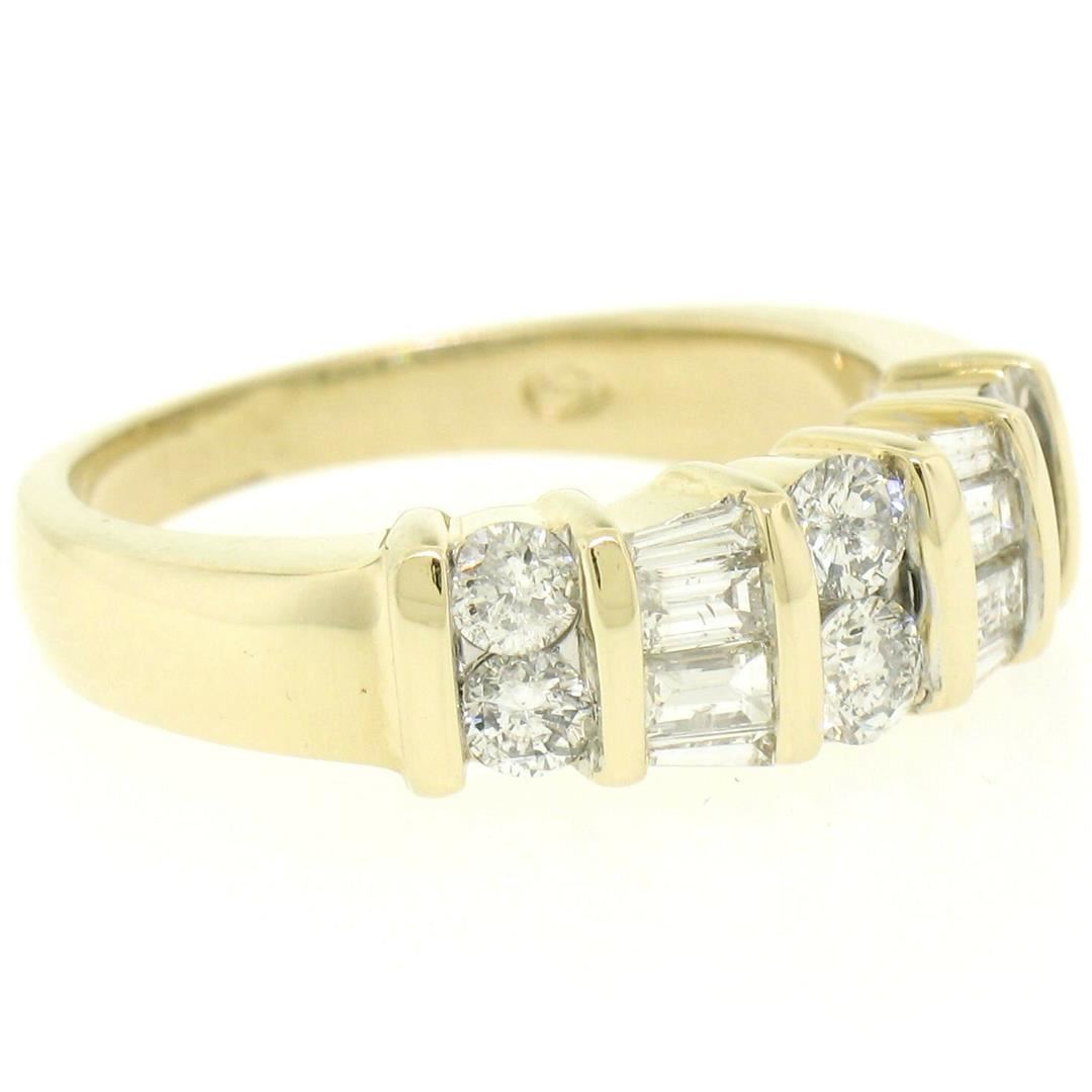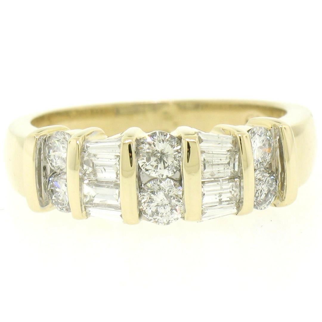 One 14K Solid Yellow Gold 1.14ctw Bar Set Round & Baguette Diamond Band Ring Size 7. Item Details: Material: 14K Solid Yellow Gold, Weight: 5.32 Grams, Stone(s): (6) Natural Genuine Diamonds - Round Brilliant Cut - Bar Set - G/H Color - SI1 Clarity - 0.54ctw (approx.), (8) Natural Genuine Diamonds - Baguette Cut - Bar Set - G/H Color - SI1 Clarity - 0.60ctw (approx.), Total Carat Weight: 1.14 (approx.), Ring Size: 7.0, Ring Width: 6.22mm, Ring Height: 4.85mm rise off the finger Condition: Like New!