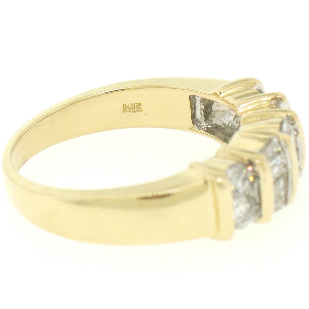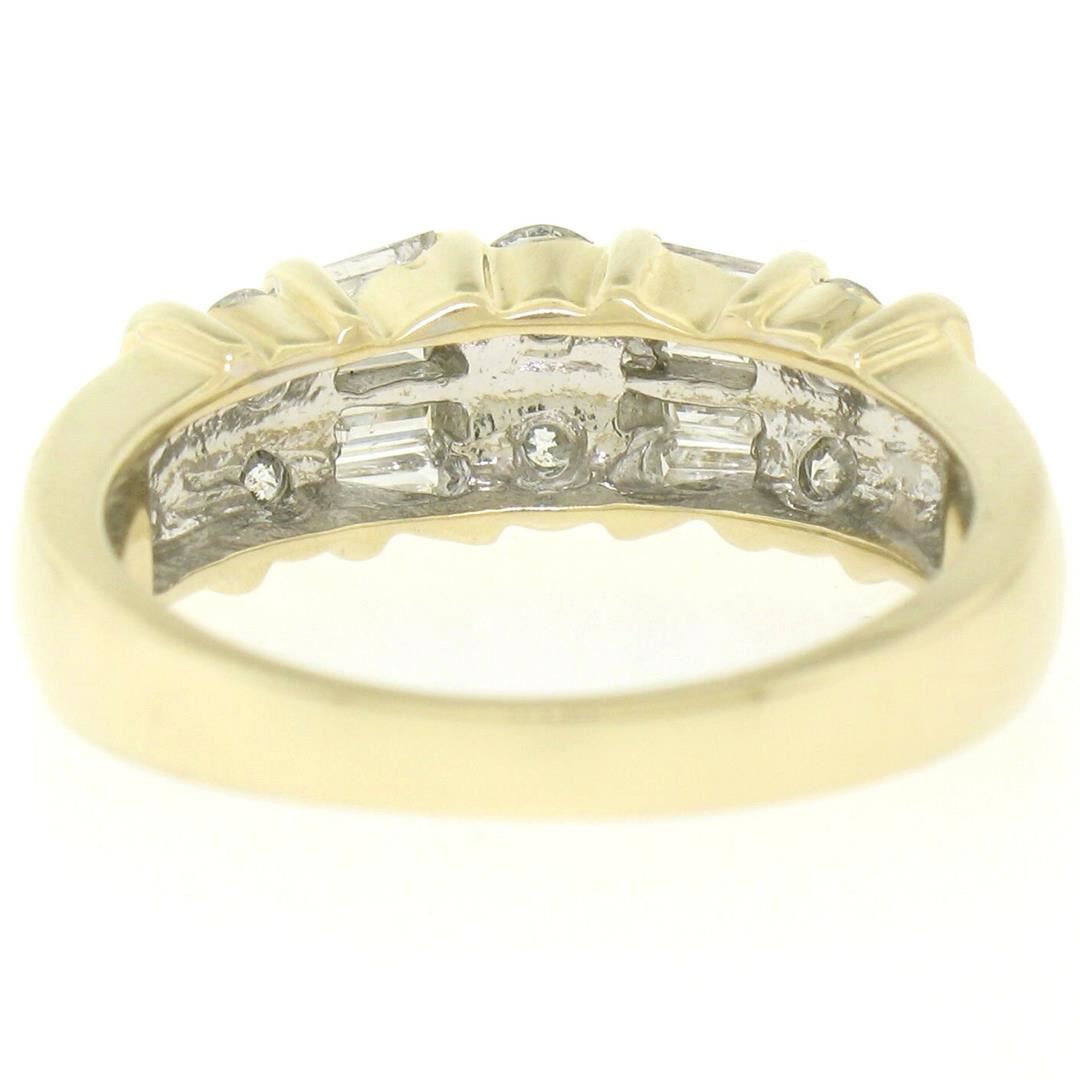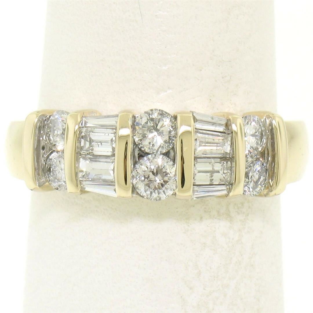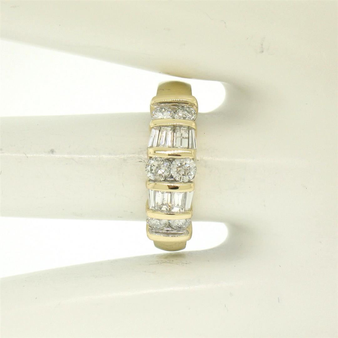One 14K Solid Yellow Gold 1.14ctw Bar Set Round & Baguette Diamond Band Ring Size 7. Item Details: Material: 14K Solid Yellow Gold, Weight: 5.32 Grams, Stone(s): (6) Natural Genuine Diamonds - Round Brilliant Cut - Bar Set - G/H Color - SI1 Clarity - 0.54ctw (approx.), (8) Natural Genuine Diamonds - Baguette Cut - Bar Set - G/H Color - SI1 Clarity - 0.60ctw (approx.), Total Carat Weight: 1.14 (approx.), Ring Size: 7.0, Ring Width: 6.22mm, Ring Height: 4.85mm rise off the finger Condition: Like New!