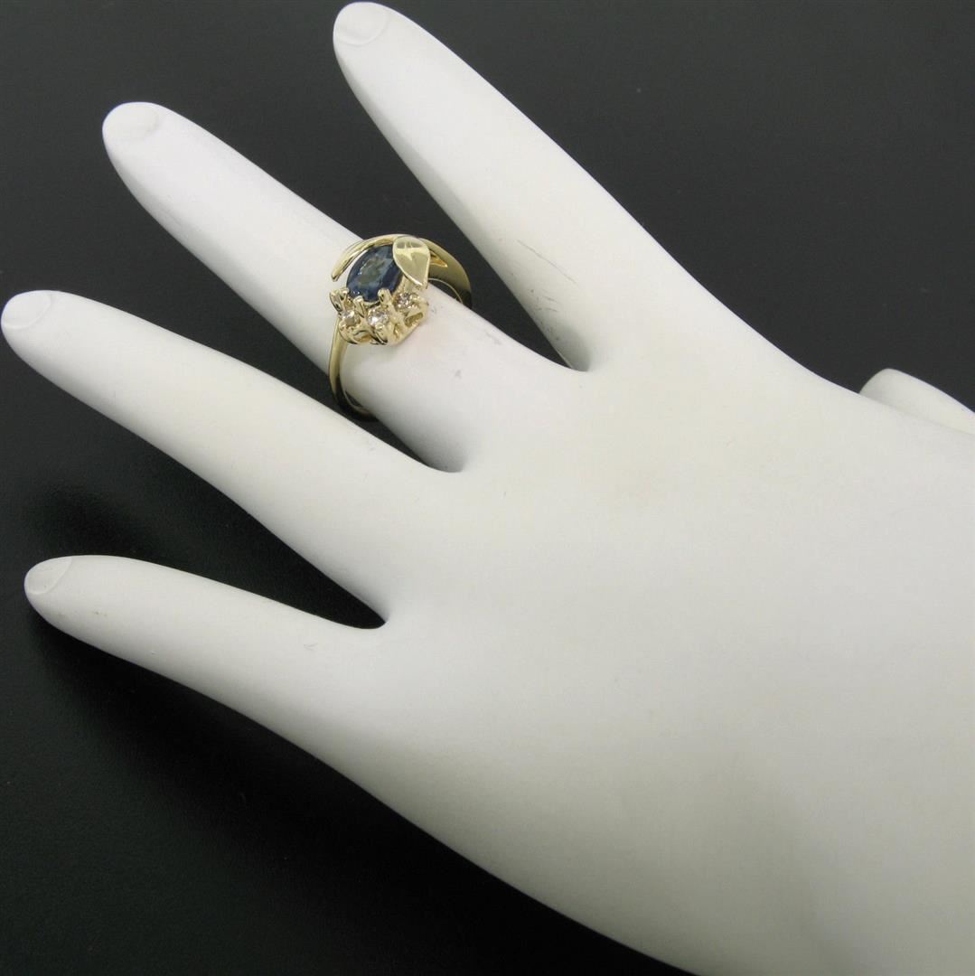 One 14K Solid Yellow Gold 1.14Ctw Oval Sapphire Blooming Flower Ring w/ Round Diamond Accents. Item Details: Material: 14K Solid Yellow Gold, Weight: 3.1 Grams, Stone(s): (1) Natural Genuine Sapphire - Oval Cut - Prong Set - Medium Royal Blue Color - 1.00ct (approx.), (4) Natural Genuine Diamonds - Round Brilliant Cut - Prong Set - I Color - VS2 Clarity - 0.14ctw (approx.), Total Carat Weight: 1.14 (approx.), Ring Size: 5.0 (We can custom size this ring.), Ring Width: 10.54mm, Ring Height: 7.60mm rise off the finger, Condition: Like New!