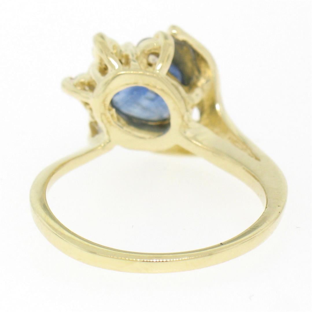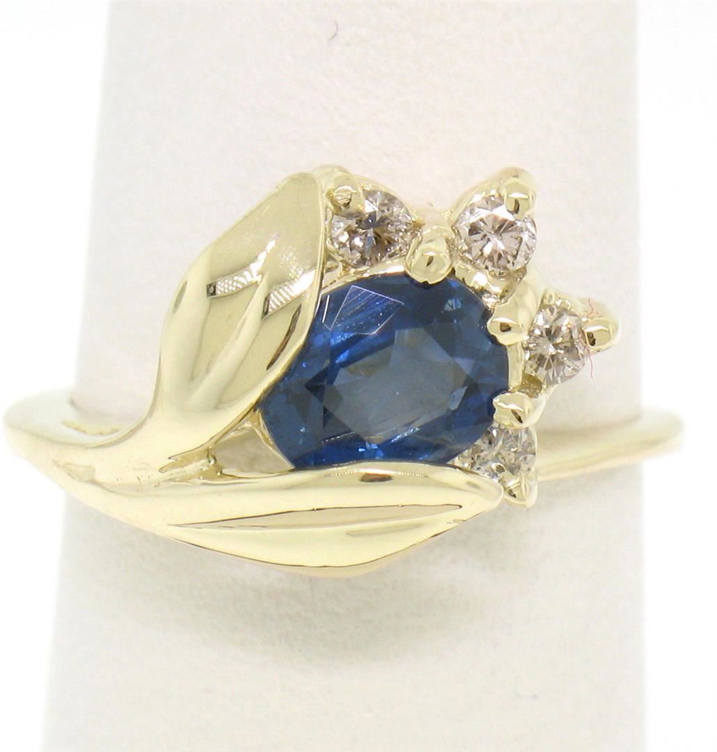One 14K Solid Yellow Gold 1.14Ctw Oval Sapphire Blooming Flower Ring w/ Round Diamond Accents. Item Details: Material: 14K Solid Yellow Gold, Weight: 3.1 Grams, Stone(s): (1) Natural Genuine Sapphire - Oval Cut - Prong Set - Medium Royal Blue Color - 1.00ct (approx.), (4) Natural Genuine Diamonds - Round Brilliant Cut - Prong Set - I Color - VS2 Clarity - 0.14ctw (approx.), Total Carat Weight: 1.14 (approx.), Ring Size: 5.0 (We can custom size this ring.), Ring Width: 10.54mm, Ring Height: 7.60mm rise off the finger, Condition: Like New!