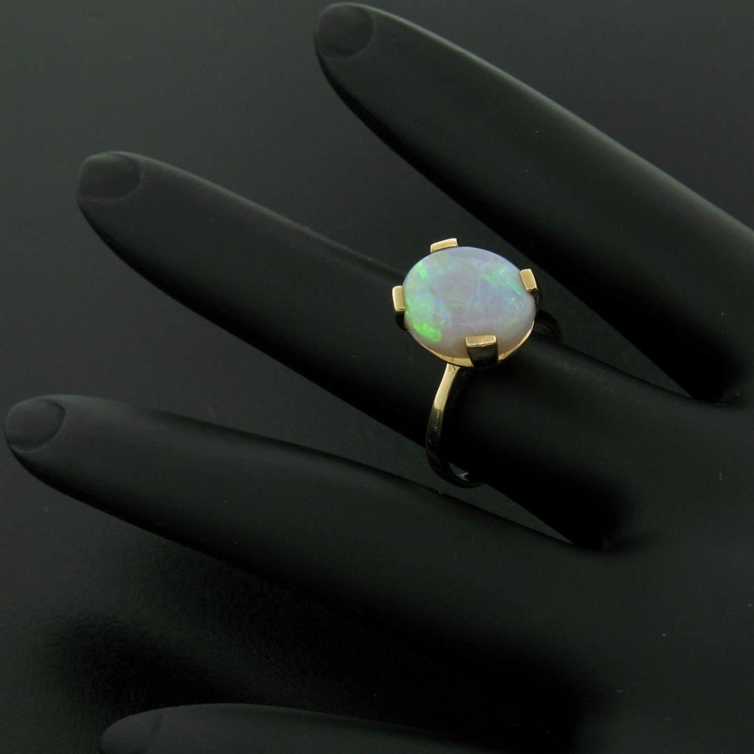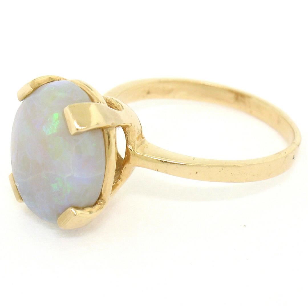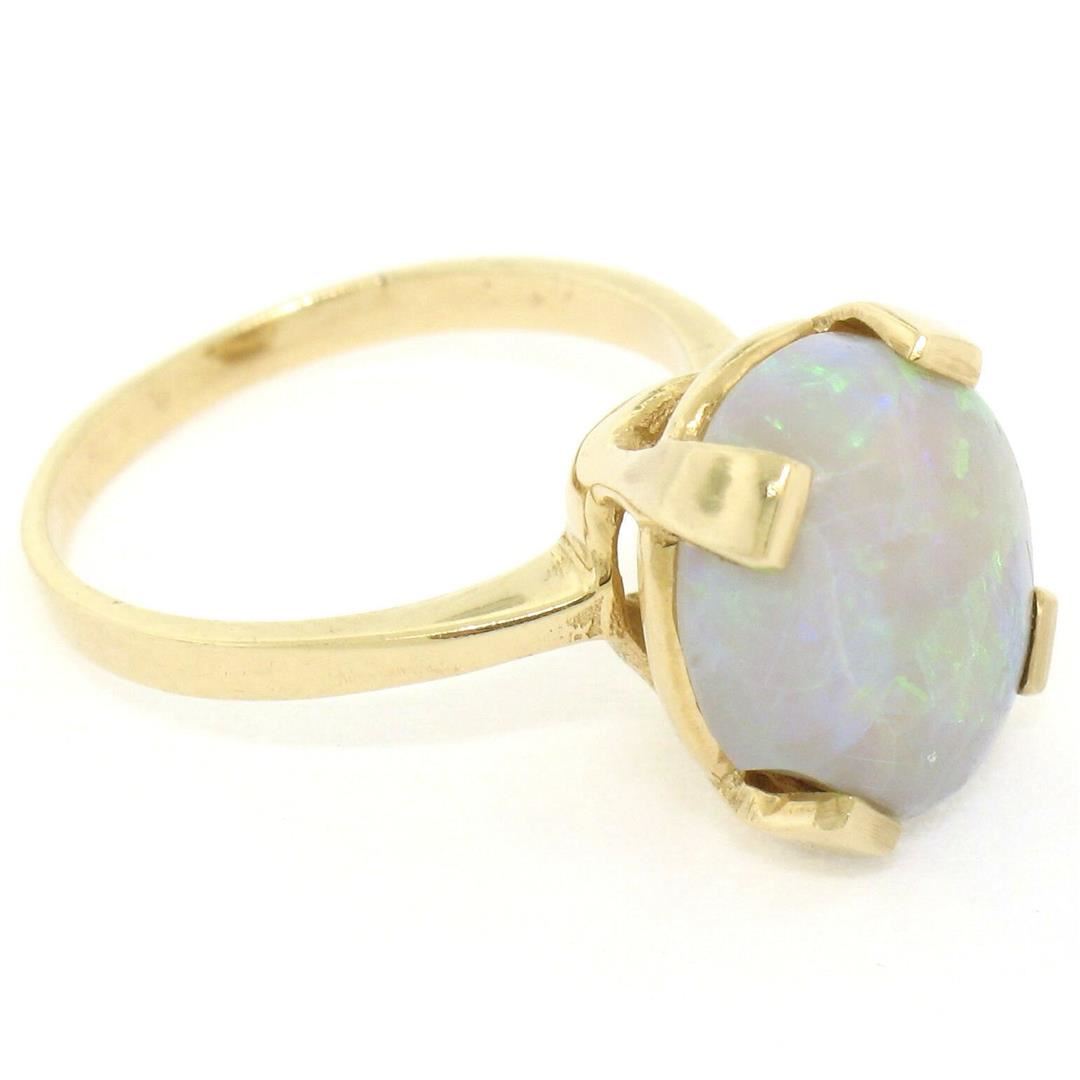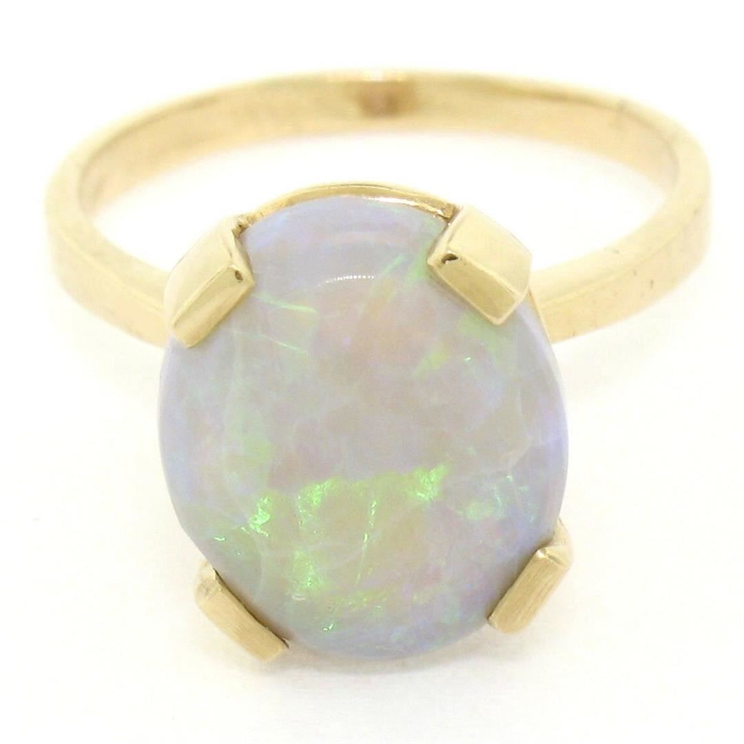 One Vintage 14K Solid Yellow Gold 3.00ct Oval Cabochon Opal Solitaire Ring Size 4.5. Item Details: Material: 14K Solid Yellow Gold, Weight: 3.15 Grams, Stone(s): (1) Natural Genuine Opal - Oval Cabochon Cut - Prong Set - White w/ Beautiful Blue and Green Play - 11.95x10.10mm, Total Carat Weight: 3.00 (approx.), Ring Size: 4.5, Ring Width: 12.00mm, Ring Height: 9.98mm rise off the finger, Condition: Vintage opal ring. The stone shows some crazing. Great overall and ready to wear condition!
